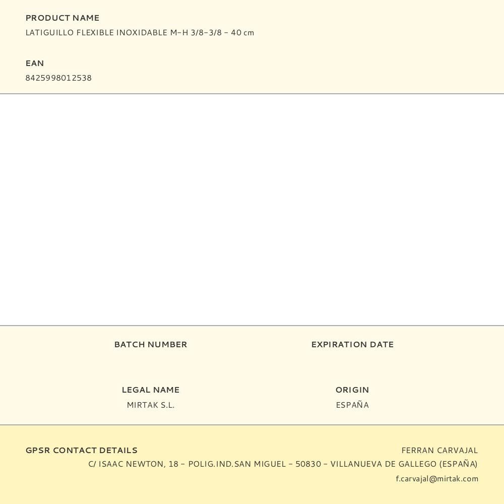 CONEXION DE AGUA POTABLE. LATIGUILLO FLEXIBLE INOXIDABLE. MACHO/HEMBRA 3/8-3/8 - 40cm (CON SOLAPA PARA COLGAR) EDM