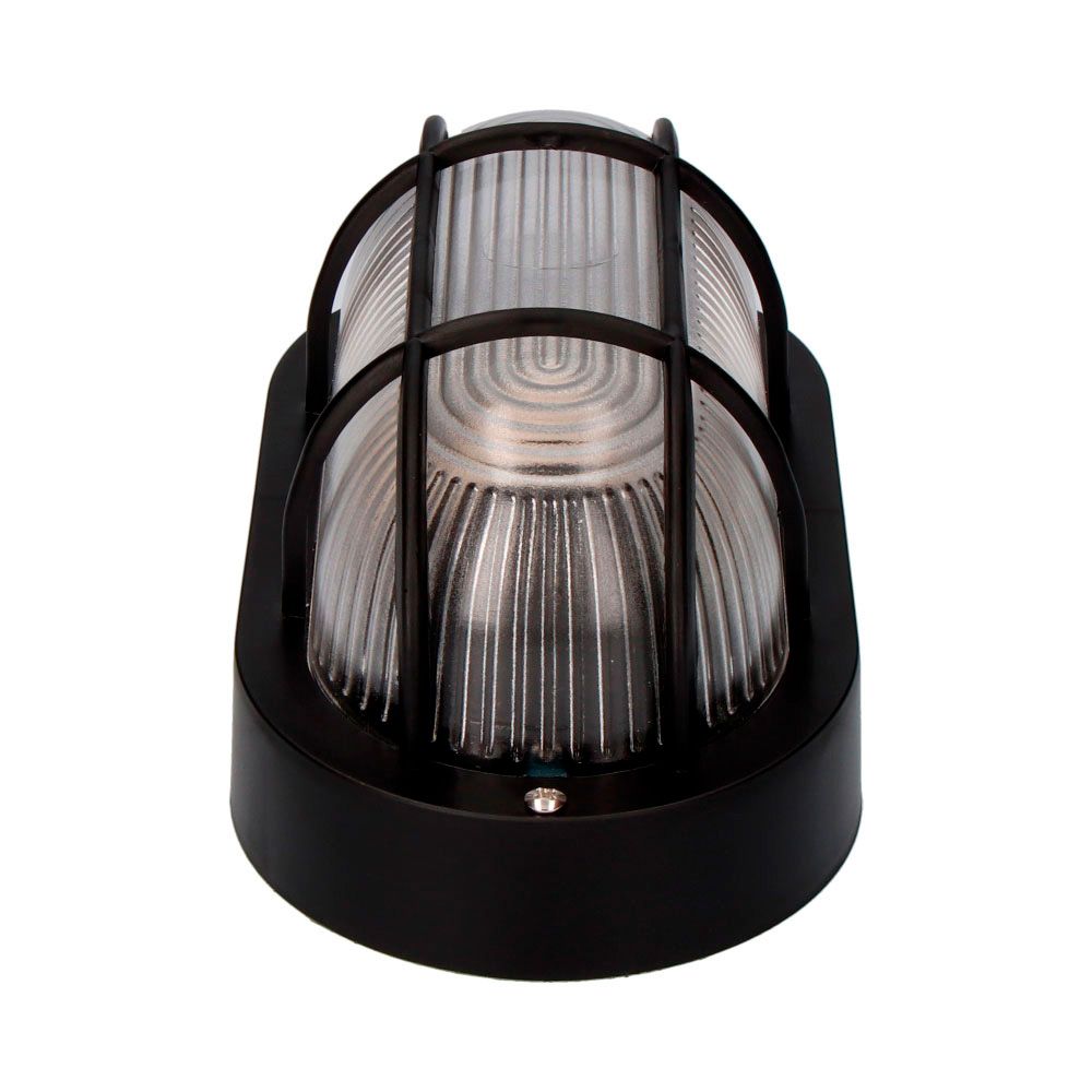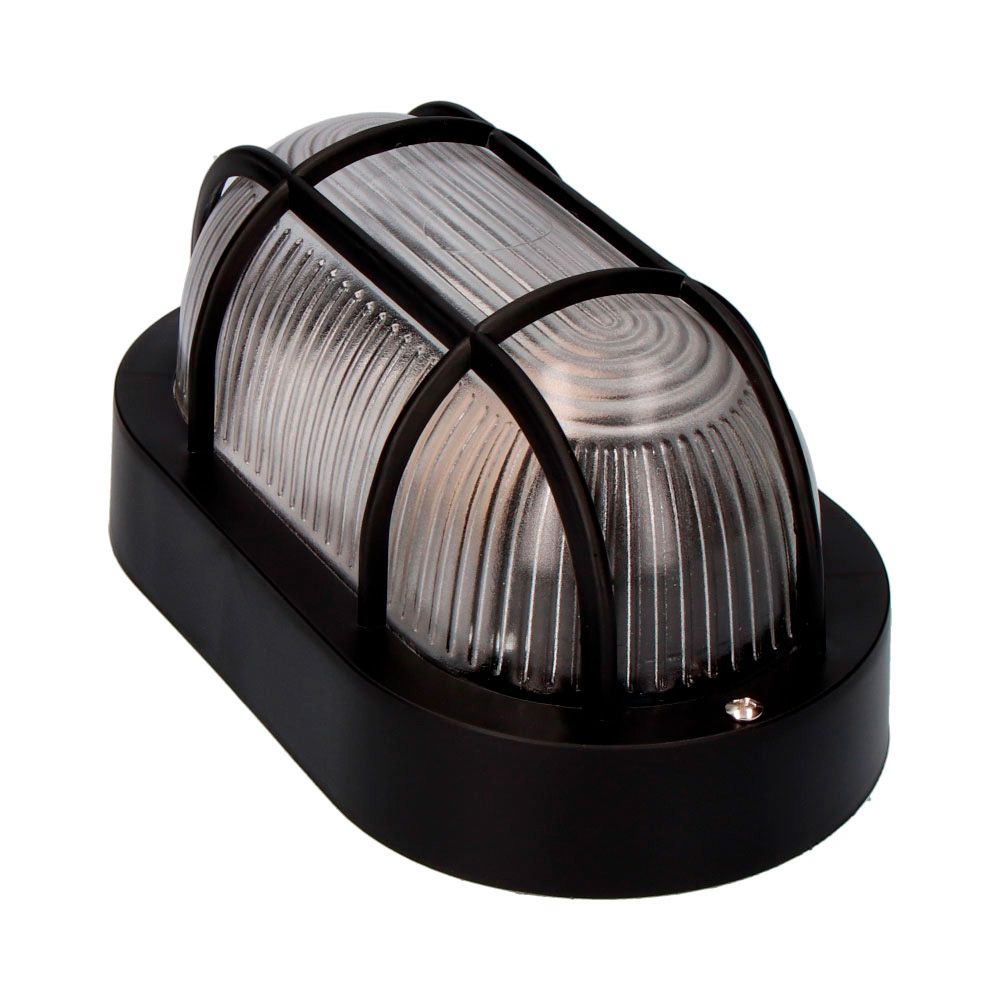 APLIQUE OVAL COLOR NEGRO 1xE27 40W MEDIDAS: 11,4x20,2x10,cm MODELO TARRAGONA (BOMBILLA NO INCLUIDA) MATERIAL: PLASTICO/CRISTAL. TENSION: 220-240V IP54