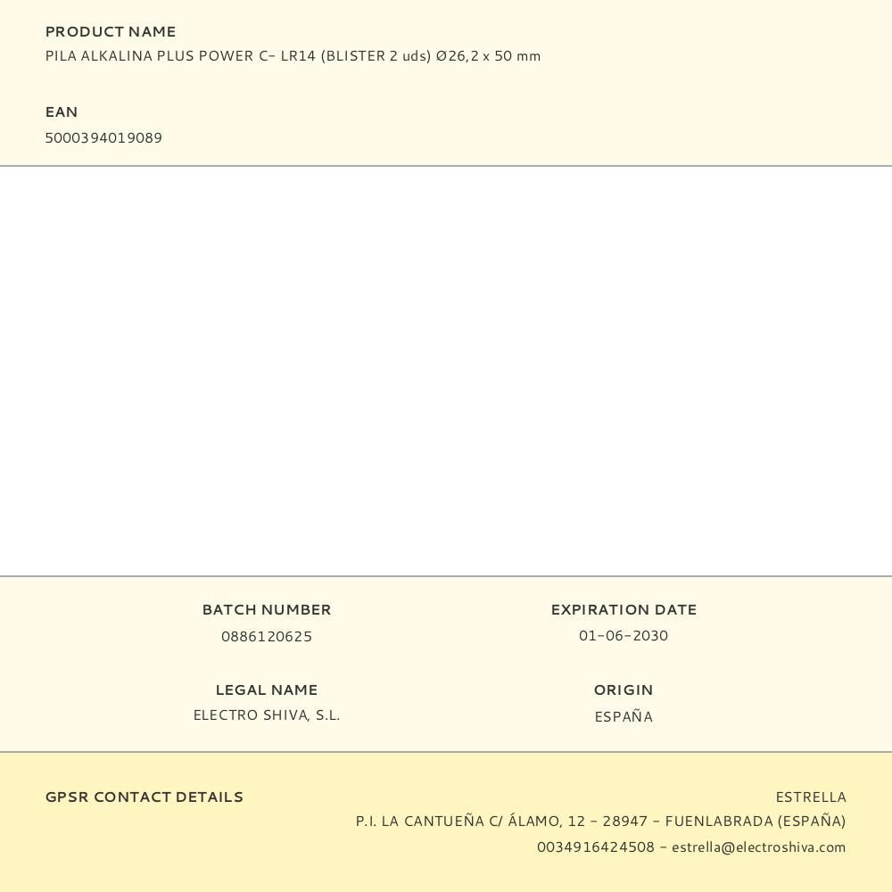 PILA ALKALINA PLUS POWER C- LR14 (BLISTER 2 uds) Ø26,2 x 50 mm