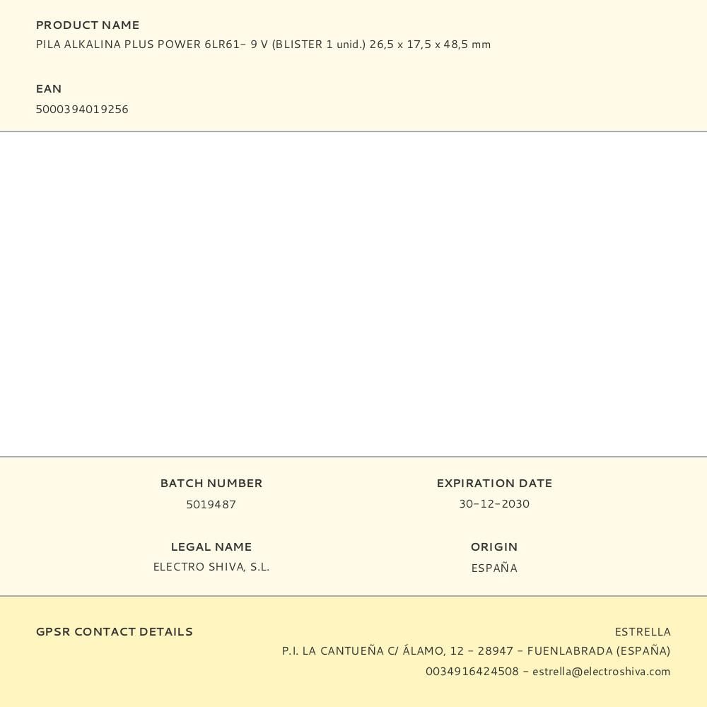 PILA ALKALINA PLUS POWER 6LR61- 9 V (BLISTER 1 unid.) 26,5 x 17,5 x 48,5 mm