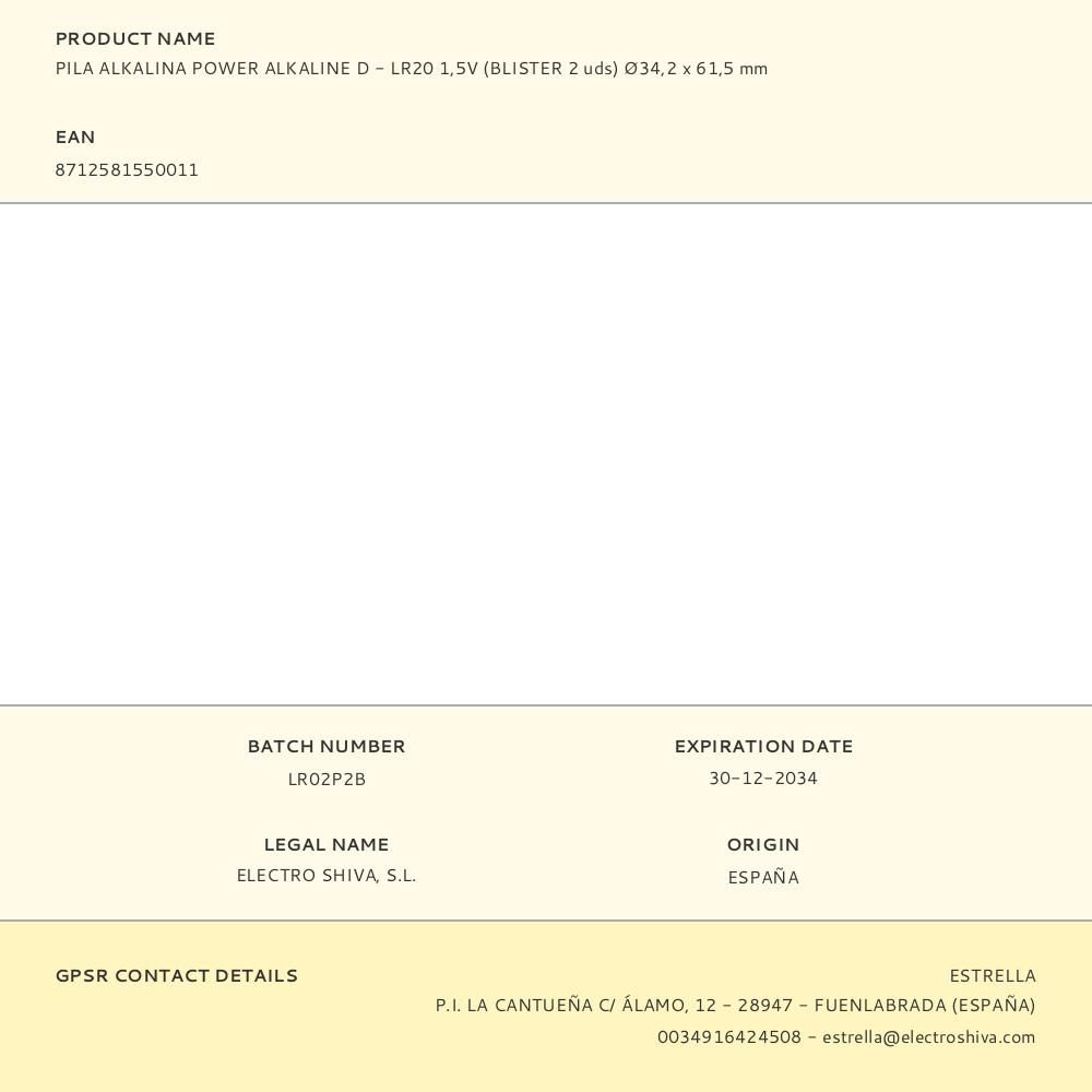 PILA ALKALINA POWER ALKALINE D - LR20 1,5V (BLISTER 2 uds) Ø34,2 x 61,5 mm