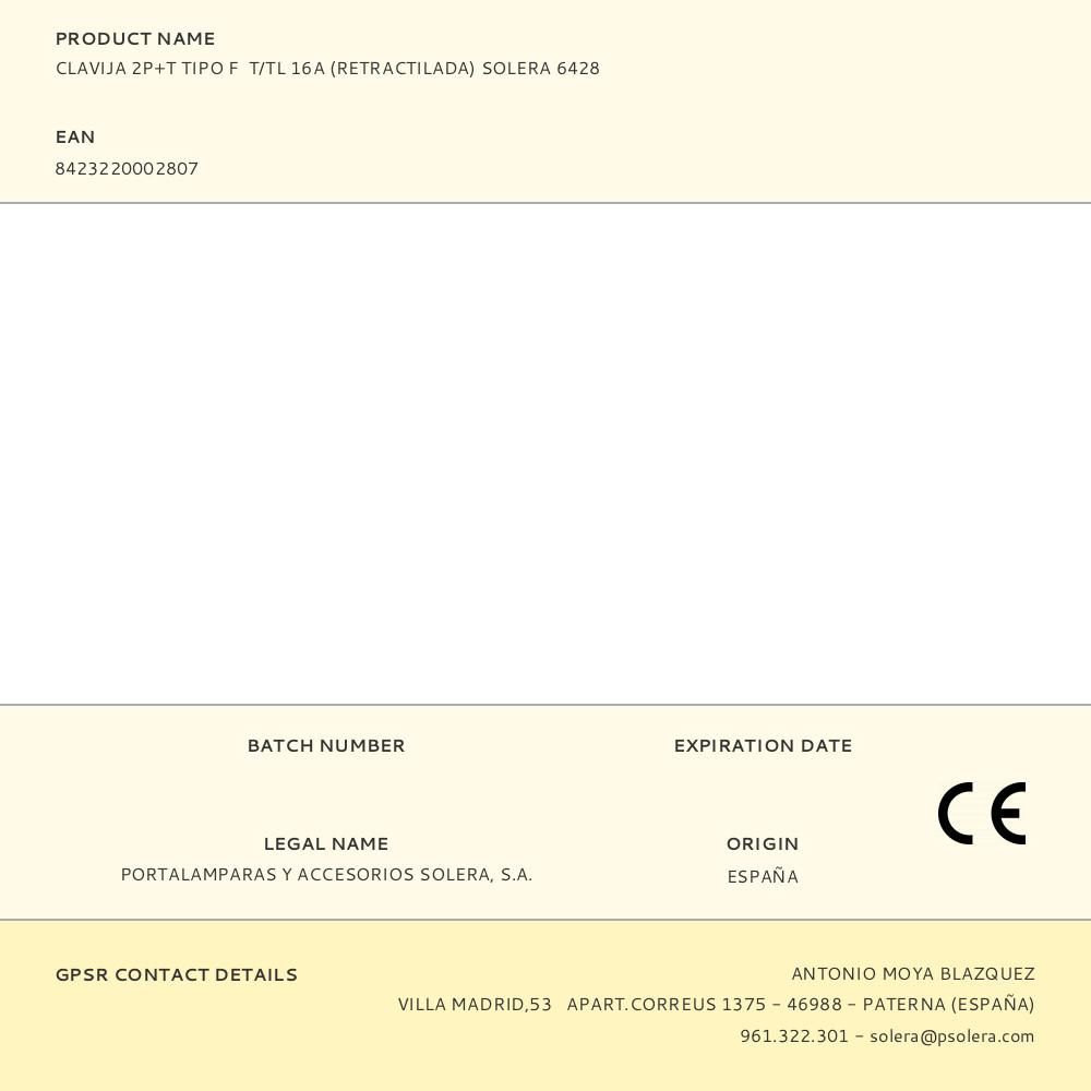 CLAVIJA 2P+T TIPO F T/TL 16A (RETRACTILADA) SOLERA 6428