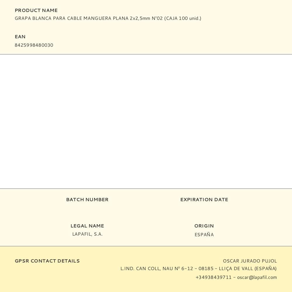 GRAPA PARA CABLE MANGUERA PLANA 2 x 2,5 mm N°02, BLANCA, CAJA 100 uds