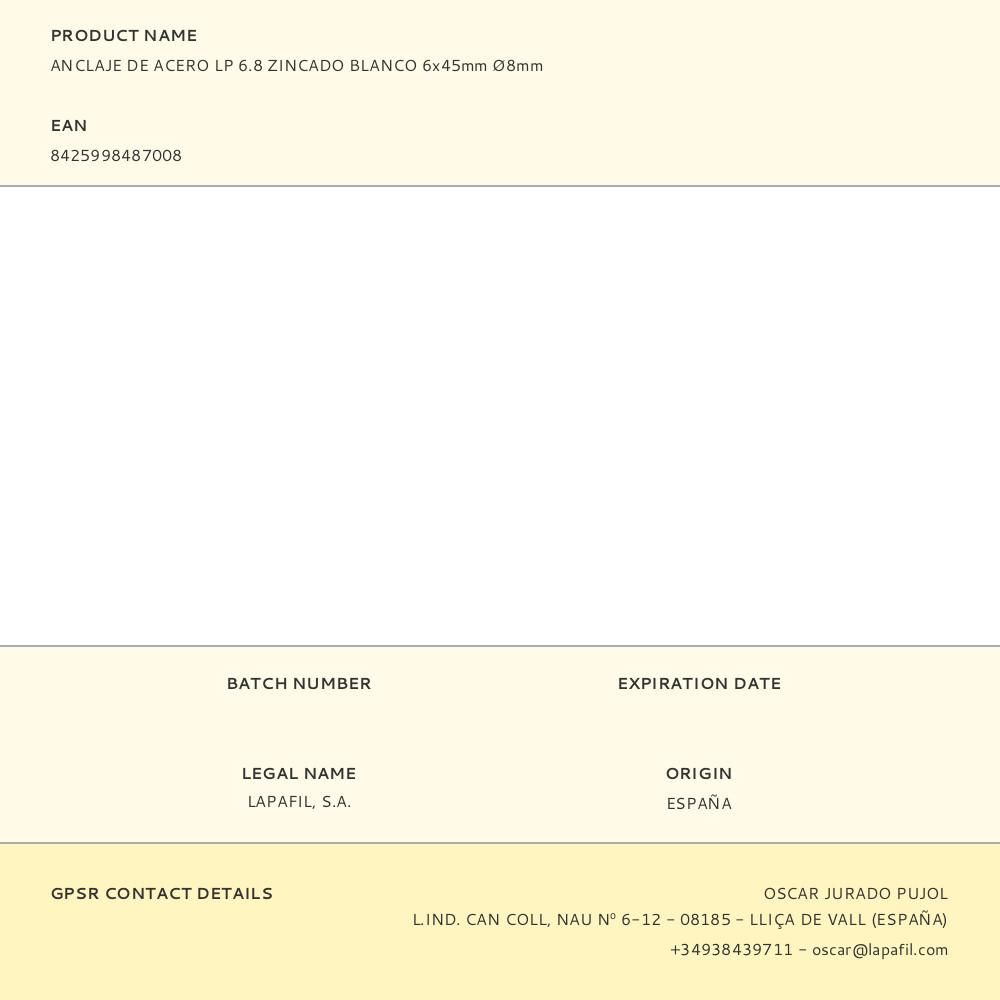 ANCLAJE DE ACERO LP 6.8 ZINCADO BLANCO 6x45mm Ø8mm