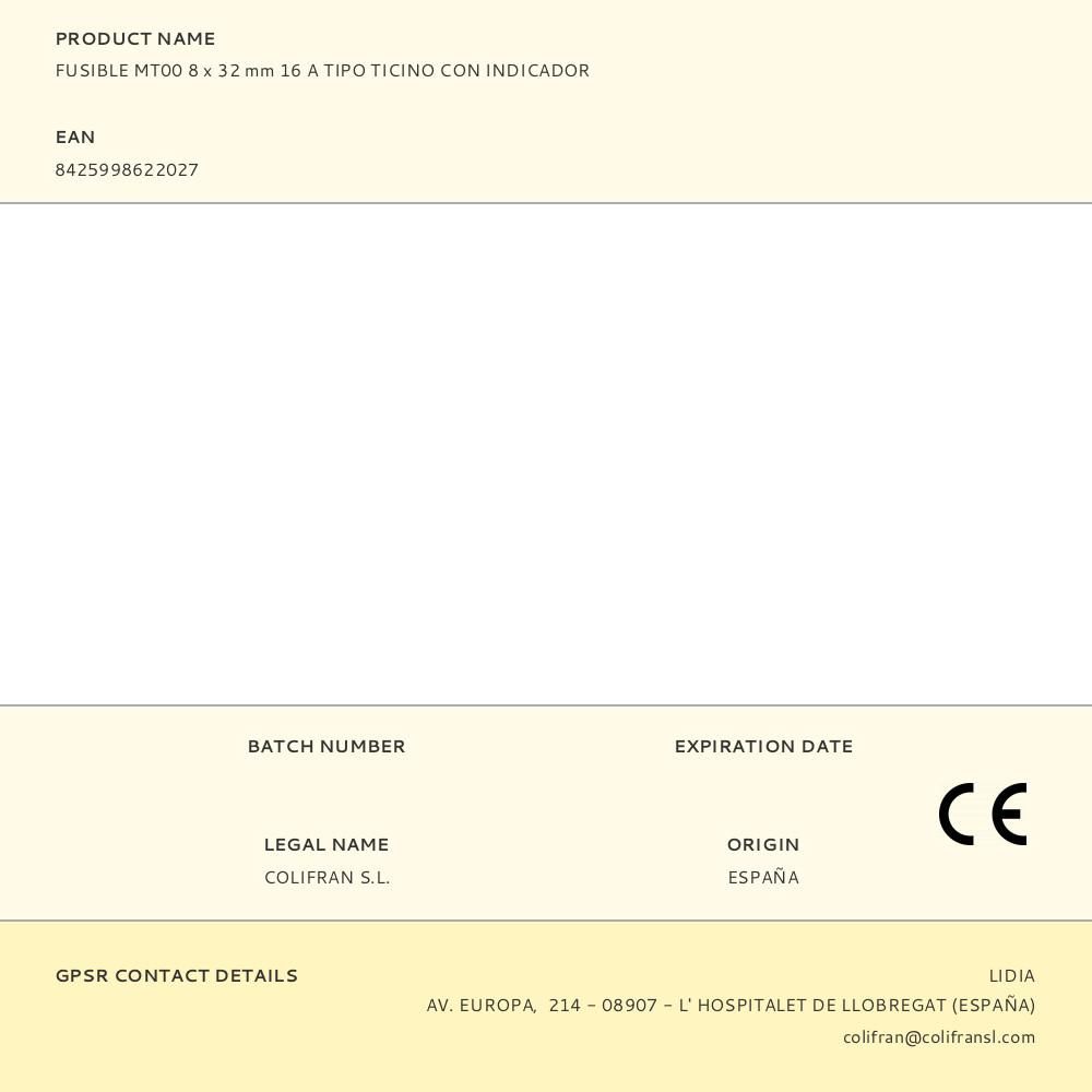 FUSIBLE MT00 16A 8 x 32 mm TIPO TICINO CON INDICADOR
