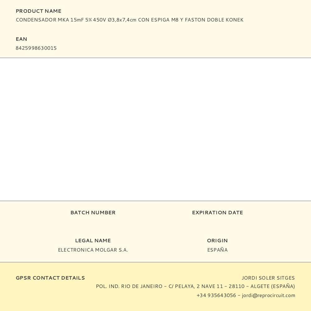 CONDENSADOR MKA 15mF 5% 450V Ø3,8x7,4cm CON ESPIGA M8 Y FASTON DOBLE KONEK
