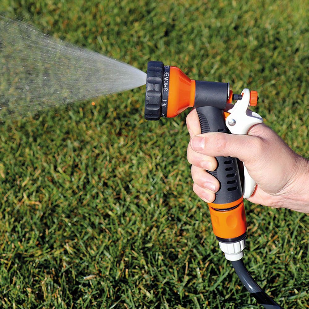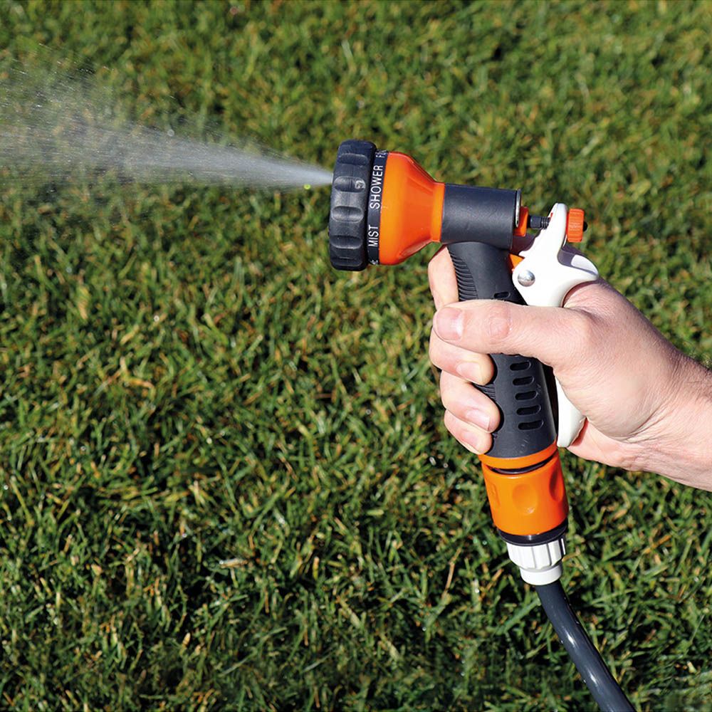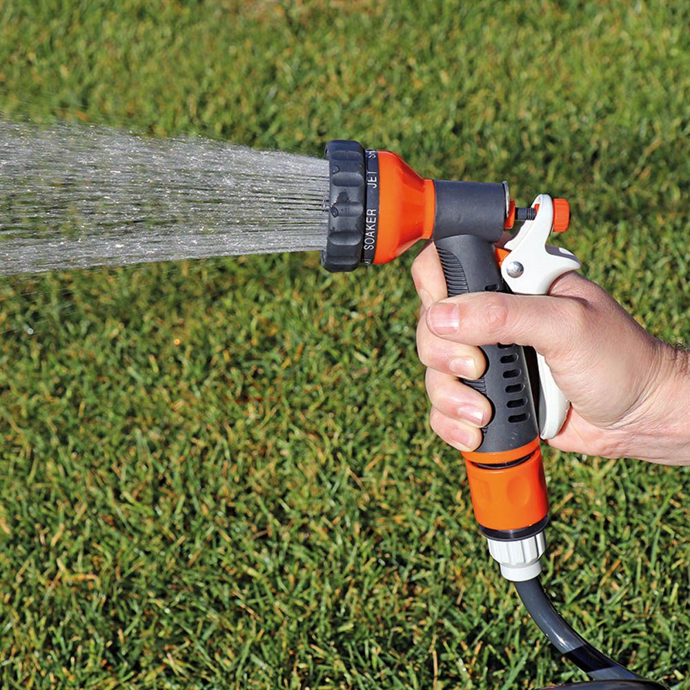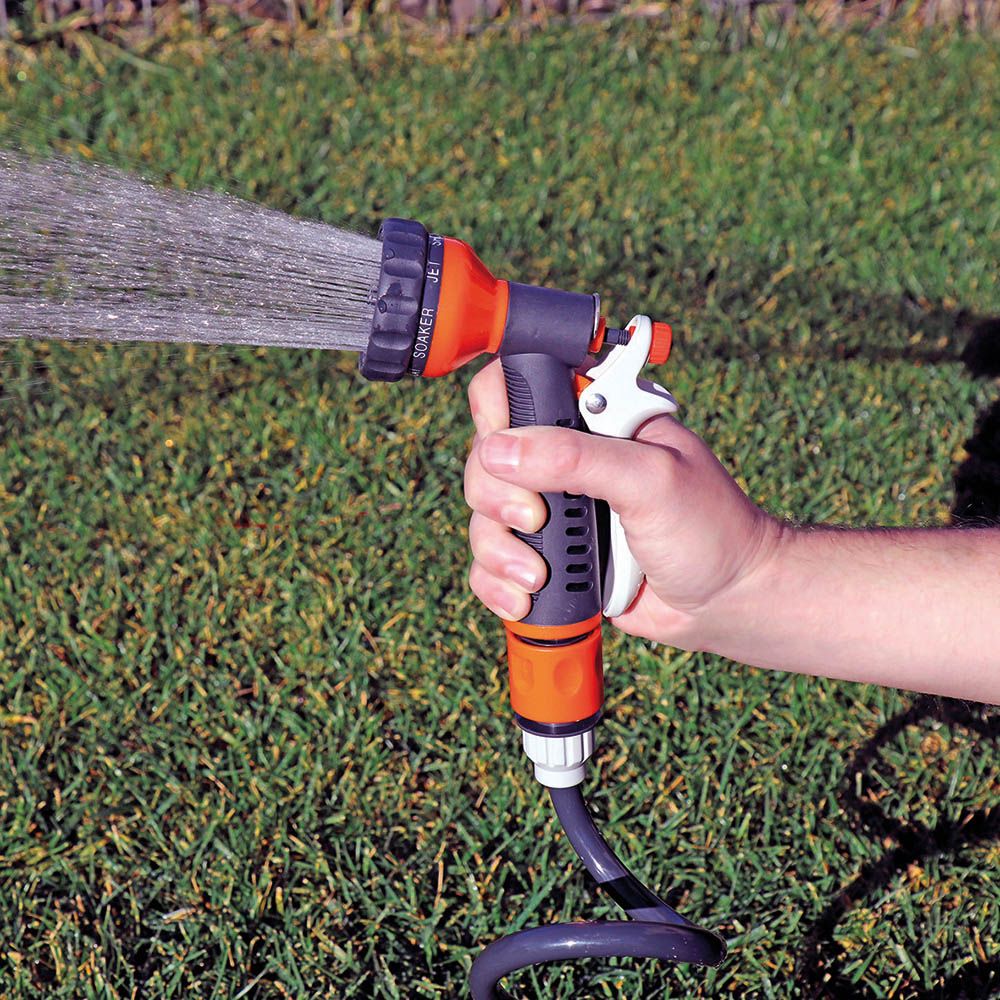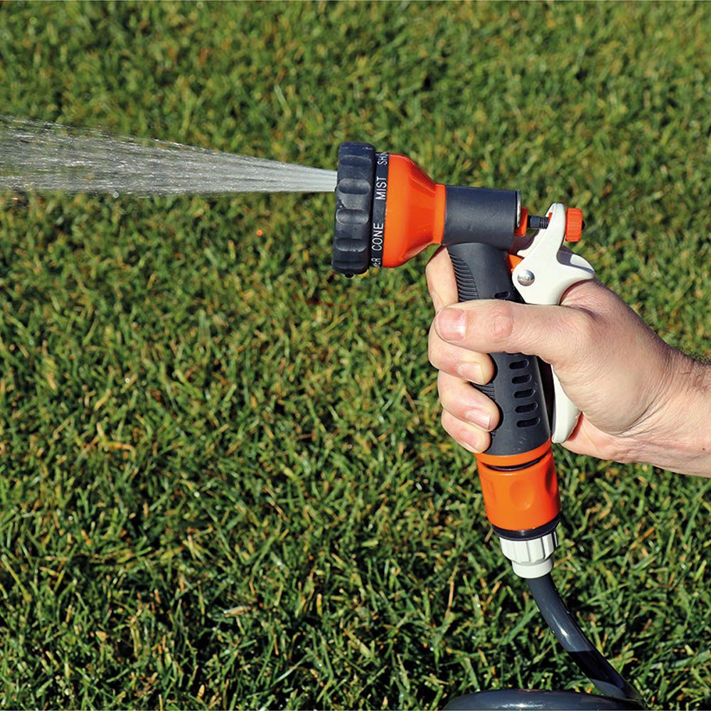 KIT MANGUERA ESPIRAL Ø9 mm, 3/8 pulg, 15 m. INCLUYE: CONEXIONES RÁPIDAS, ADAPTADOR PARA GRIFO ROSCA ½ pulg - ¾ pulg Y PISTOLA CON 7 MODOS AJUSTABLES DE PULVERIZACIÓN. PRESIÓN MÁXIMA 8 Bar