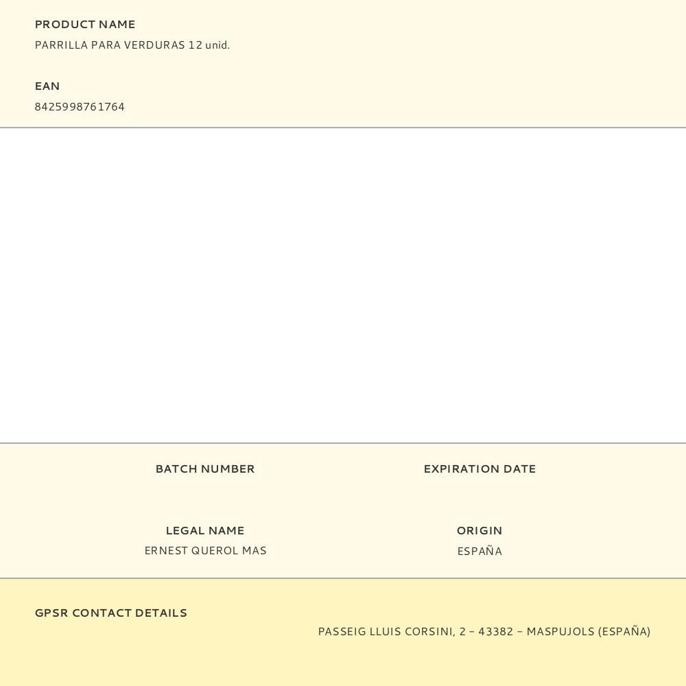 PARRILLA PARA VERDURAS 12 unid. MEDIDAS: 34x25.5cm CON ACABADO CINCADO GOURMET KITCHEN. EL PRODUCTO CUMPLE CON LA NORMATIVA CE1935/2004 SIENDO APTA PARA EL CONTACO CON ALIMENTOS