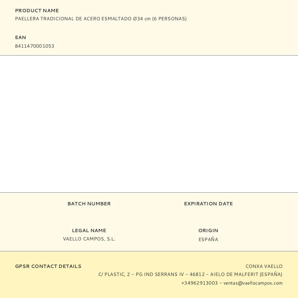PAELLERA TRADICIONAL DE ACERO ESMALTADO Ø34cm (6 PERSONAS). APTA PARA COCINAS DE GAS. FABRICACION NACIONAL. ATENCIÓN: REQUIERE MANTENIMIENTO. DEBE SER ALMACENADO CON UNA CUBIERTA DE ACEITE. VAELLO