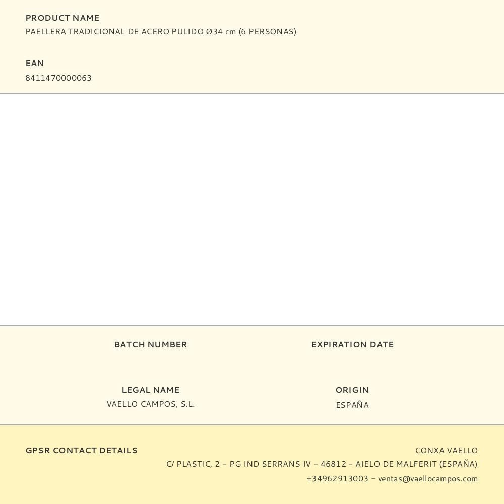 PAELLERA TRADICIONAL DE ACERO PULIDO Ø34cm (6 PERSONAS). APTA PARA COCINAS DE GAS. FABRICACION NACIONAL. ATENCIÓN: REQUIERE MANTENIMIENTO. DEBE SER ALMACENADO CON UNA CUBIERTA DE ACEITE. VAELLO