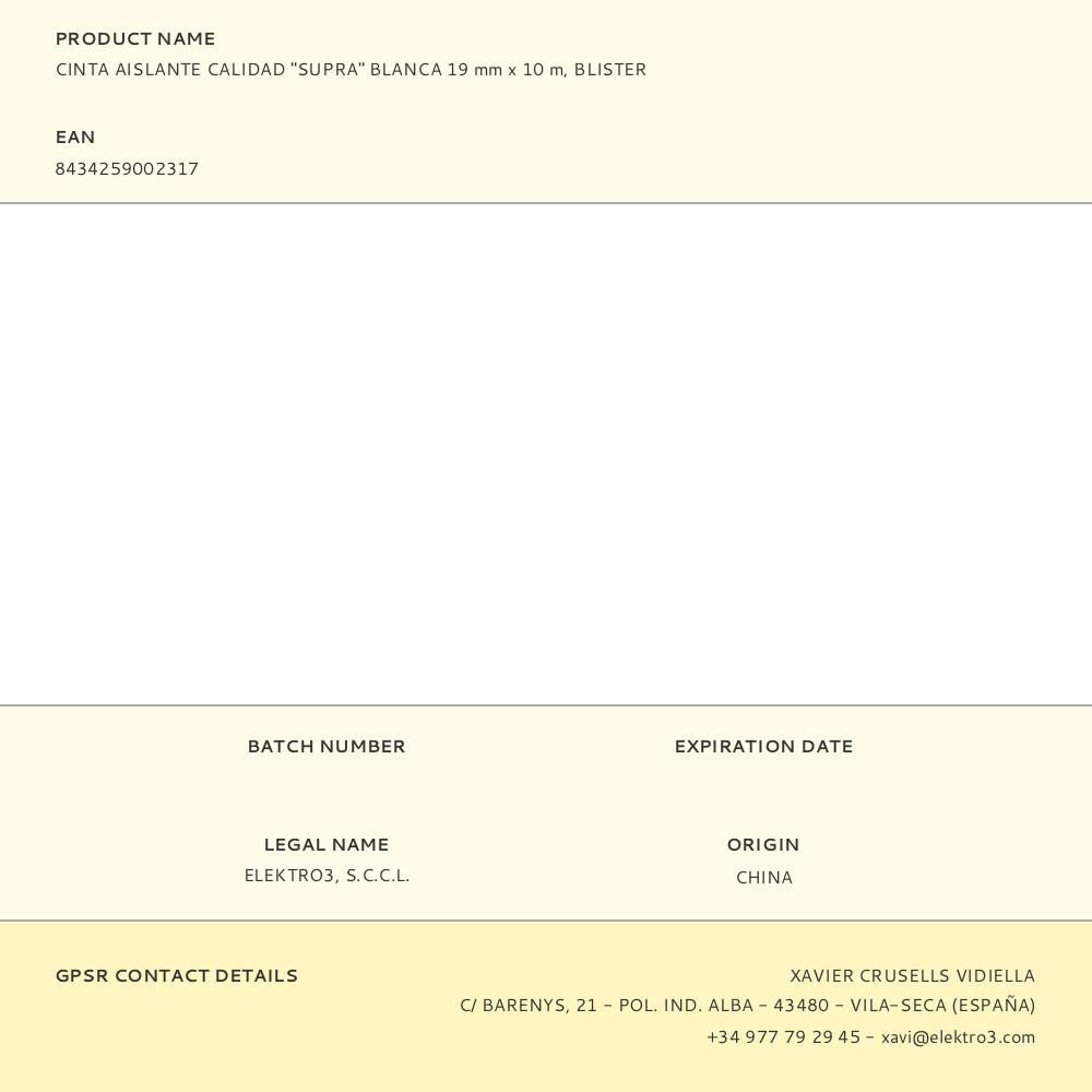 CINTA AISLANTE CALIDAD "SUPRA" BLANCA 19 mm x 10 m, BLISTER