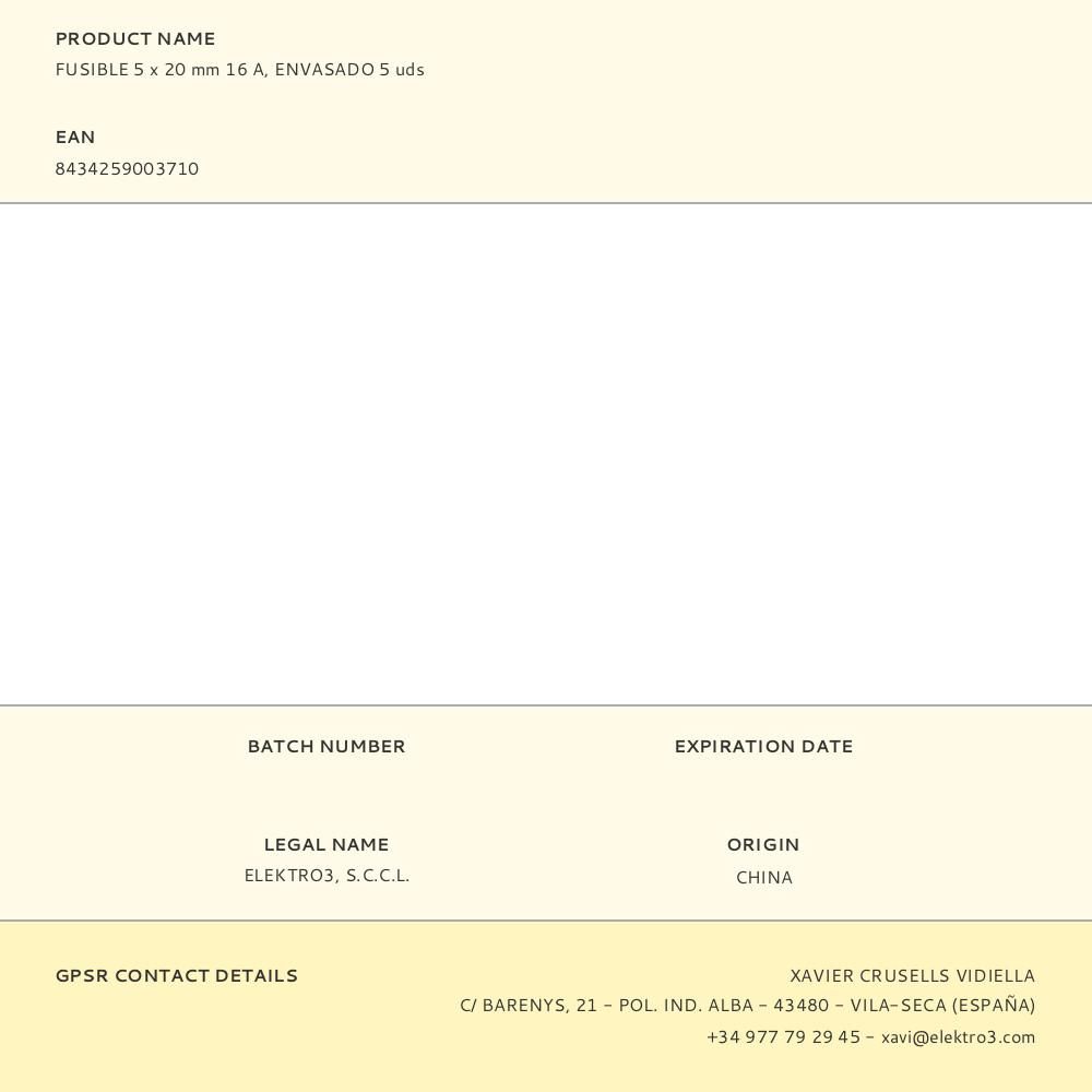 FUSIBLE 5 x 20 mm 16 A, ENVASADO 5 uds