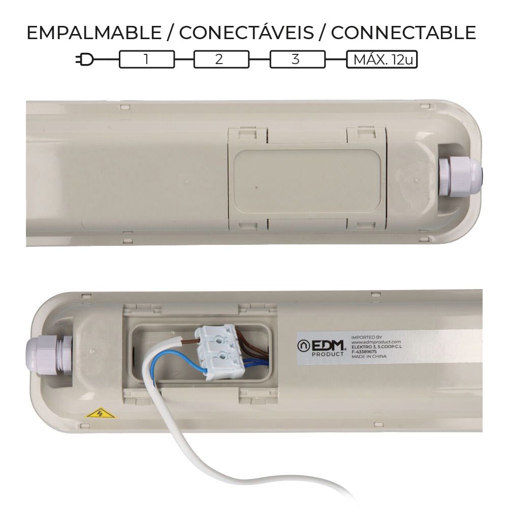 REGLETA ESTANCA LED IP65 36 w 4034 lm 6500K LUZ FRIA, CONECTABLES ENTRE SI MÁXIMO 12 UNIDADES, 120° CON SOPORTES 220-240V, 25.000 h CUMPLE CON NORMATIVA CE. IK08. MEDIDAS: 8,6 x 118 x 6,6 cm (EQUIVALENTE 120 cm)