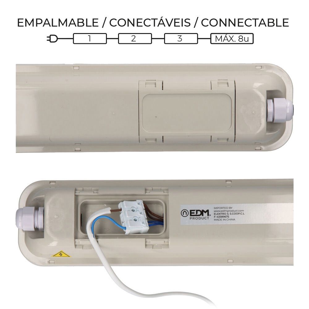 REGLETA ESTANCA LED IP65 48 w 5274 lm 6500 k LUZ FRIA, CONECTABLES ENTRE SI MÁXIMO 8 UNIDADES, 120° CON SOPORTES 220-240 V, 25.000 h CUMPLE CON NORMATIVA CE. IK08. MEDIDAS: 8,6 x 148 x 6,6 cm (EQUIVALENTE 150 cm)