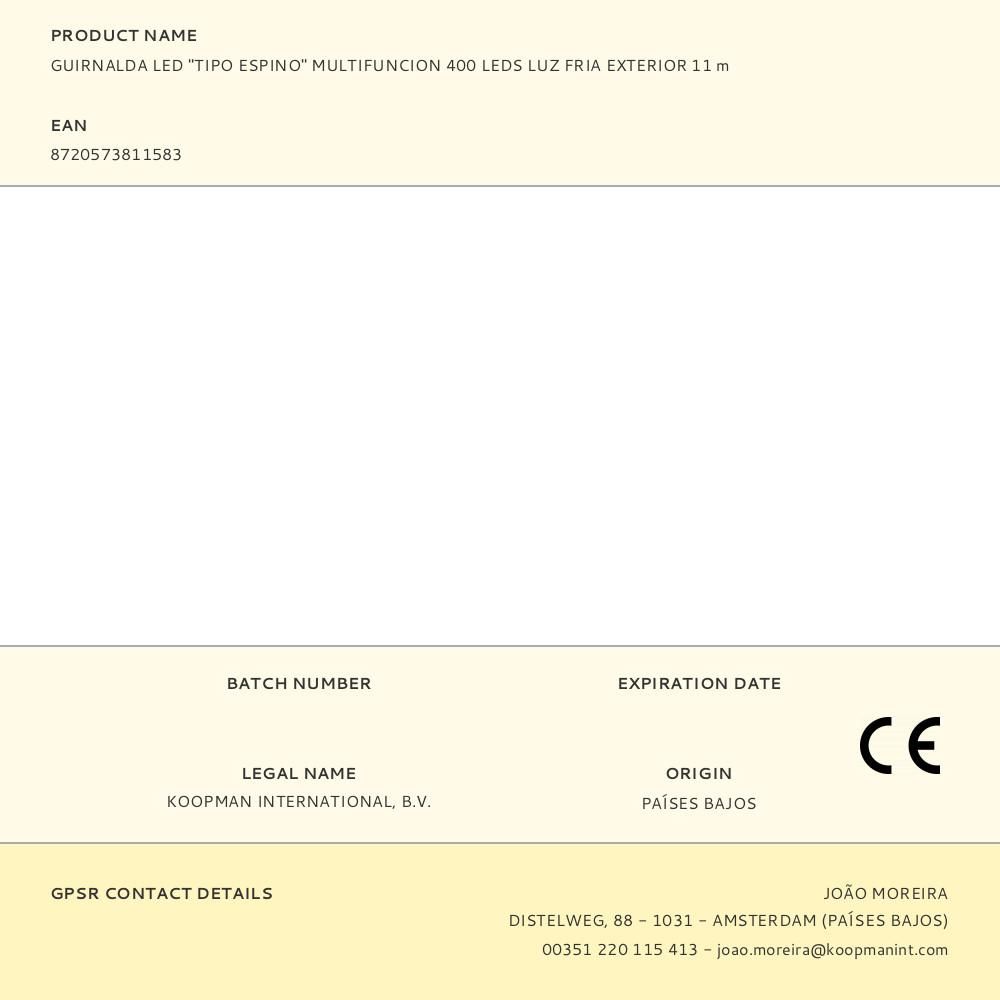 GUIRNALDA "TIPO ESPINO" 400 LEDS, LUZ FRÍA, 220 - 240 V 50/60 Hz, EXTERIOR IP44, CABLE VERDE, CON 8 FUNCIONES DE EFECTO INTERMITENTE, INCLUYENDO MODO FIJO, TEMPORIZADOR: 8 h ENCENDIDO / 16 h APAGADO, DISTANCIA ENTRE BOMBILLAS 2 cm, DISTANCIA ENTRE LA PRIMERA BOMBILLA Y LA ÚLTIMA 8 m, CABLE ALIMENTACIÓN 3 m, LARGO TOTAL: 11 m, PARA ÁRBOL DE 150 cm
