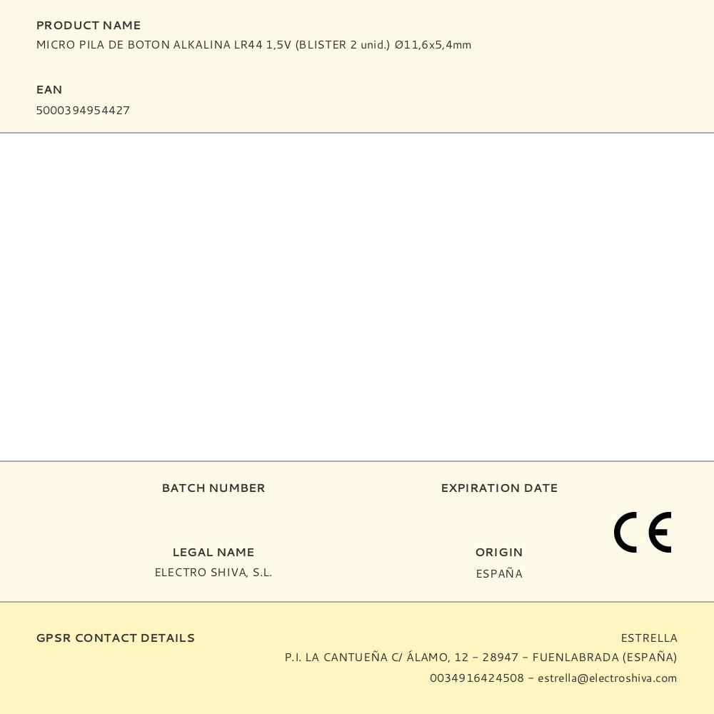 MICRO PILA DE BOTÓN ALCALINA LR44 - V13GA 1,5 V Ø11,6 x 5,4 mm BLISTER 2 uds