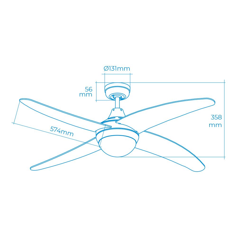VENTILADOR DE TECHO MODELO CASPIO. COLOR PLATEADO/NIQUEL. POTENCIA: 60W ASPAS: Ø132cm 3 VELOCIDADES. CON MANDO A DISTANCIA. CAUDAL DE AIRE: 7218m³/h AC-220-240V 50Hz CON LUZ (2xE27 MAX. 40W MAX. 10,7cm NO INCLUIDAS) 4 ASPAS EDM