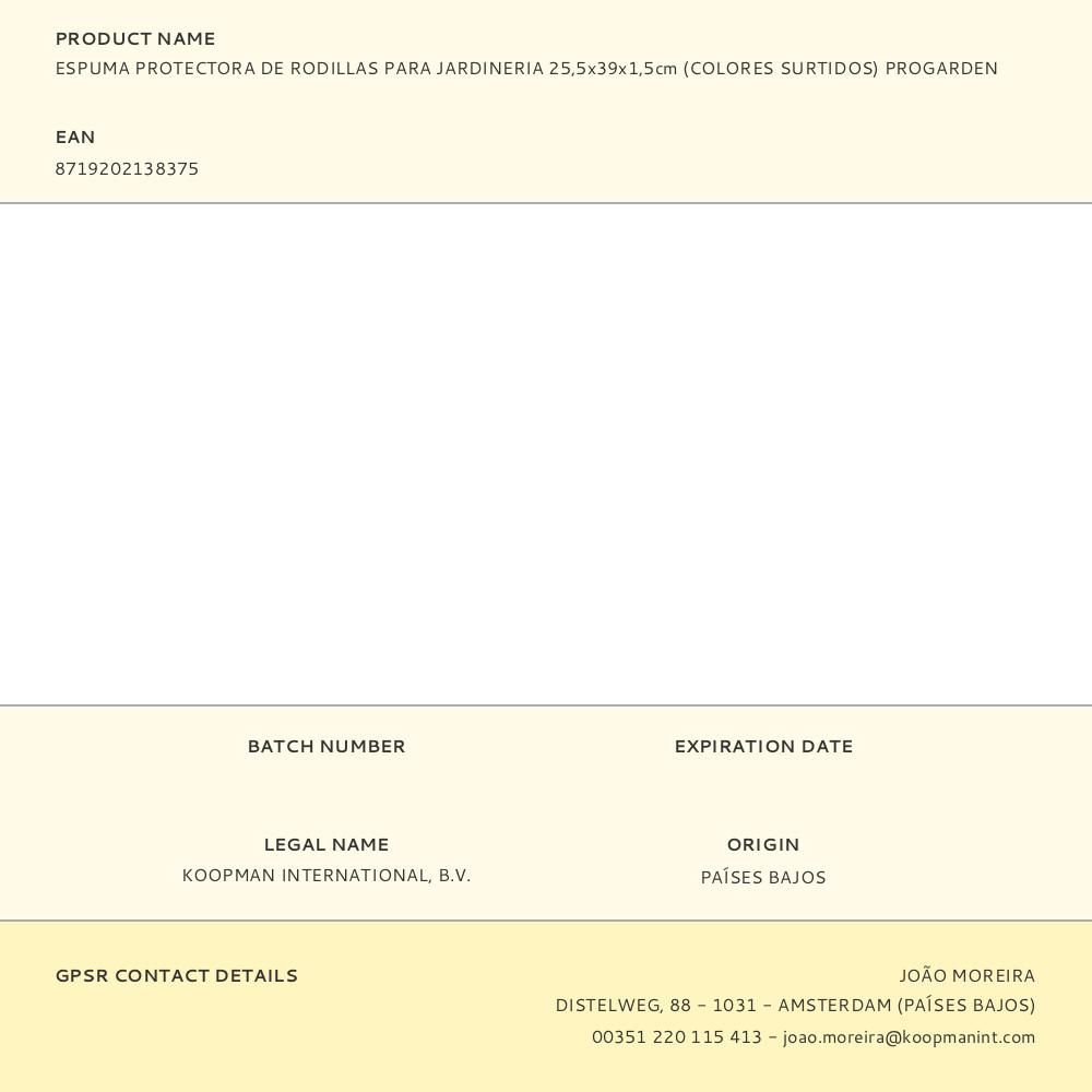 ESPUMA PROTECTORA DE RODILLAS PARA JARDINERIA 25,5x39x1,5cm (ancho/fondo/alto) MATERIAL: POLIPROPILENO. (COLORES SURTIDOS) PROGARDEN