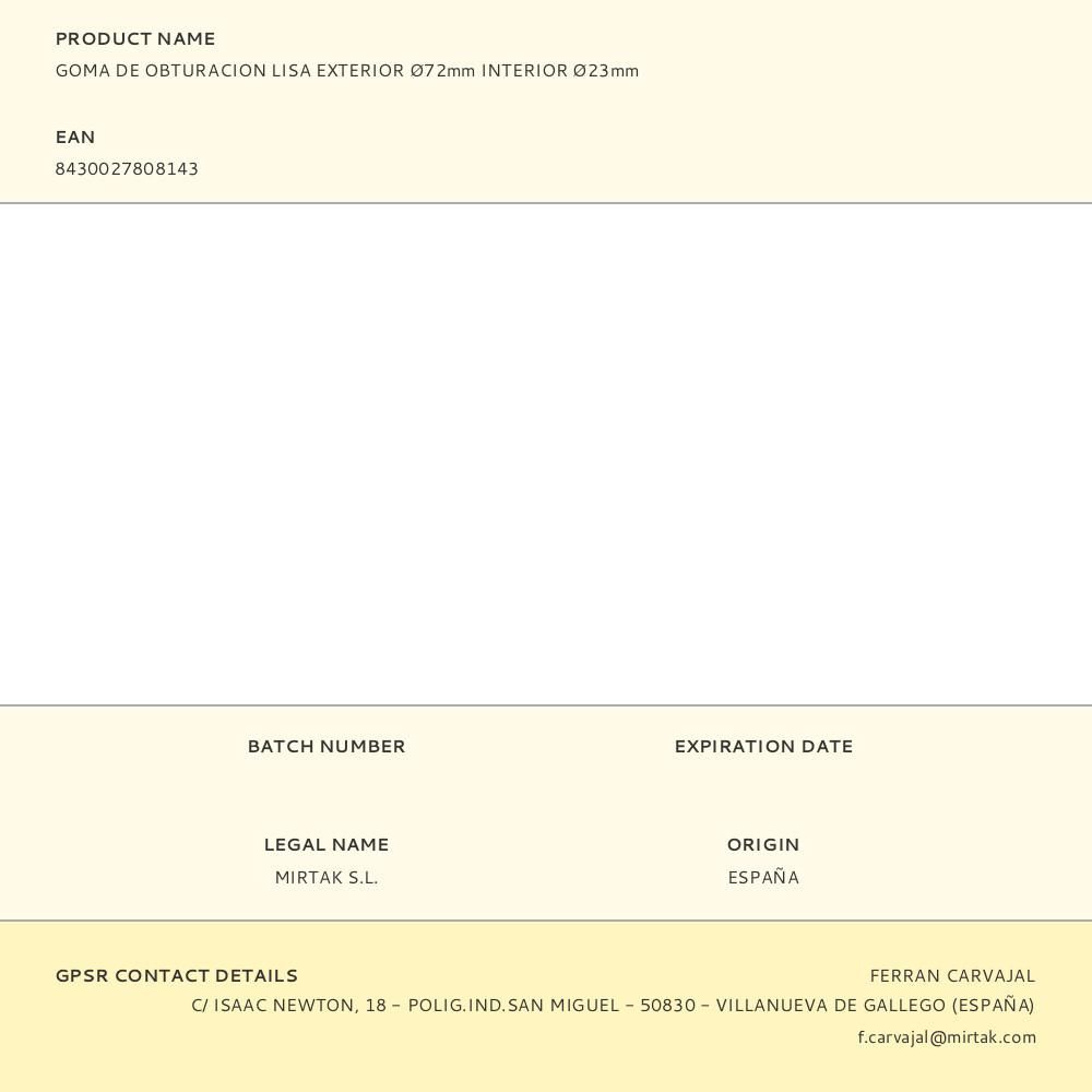GOMA DE OBTURACION LISA EXTERIOR Ø72mm INTERIOR Ø23mm