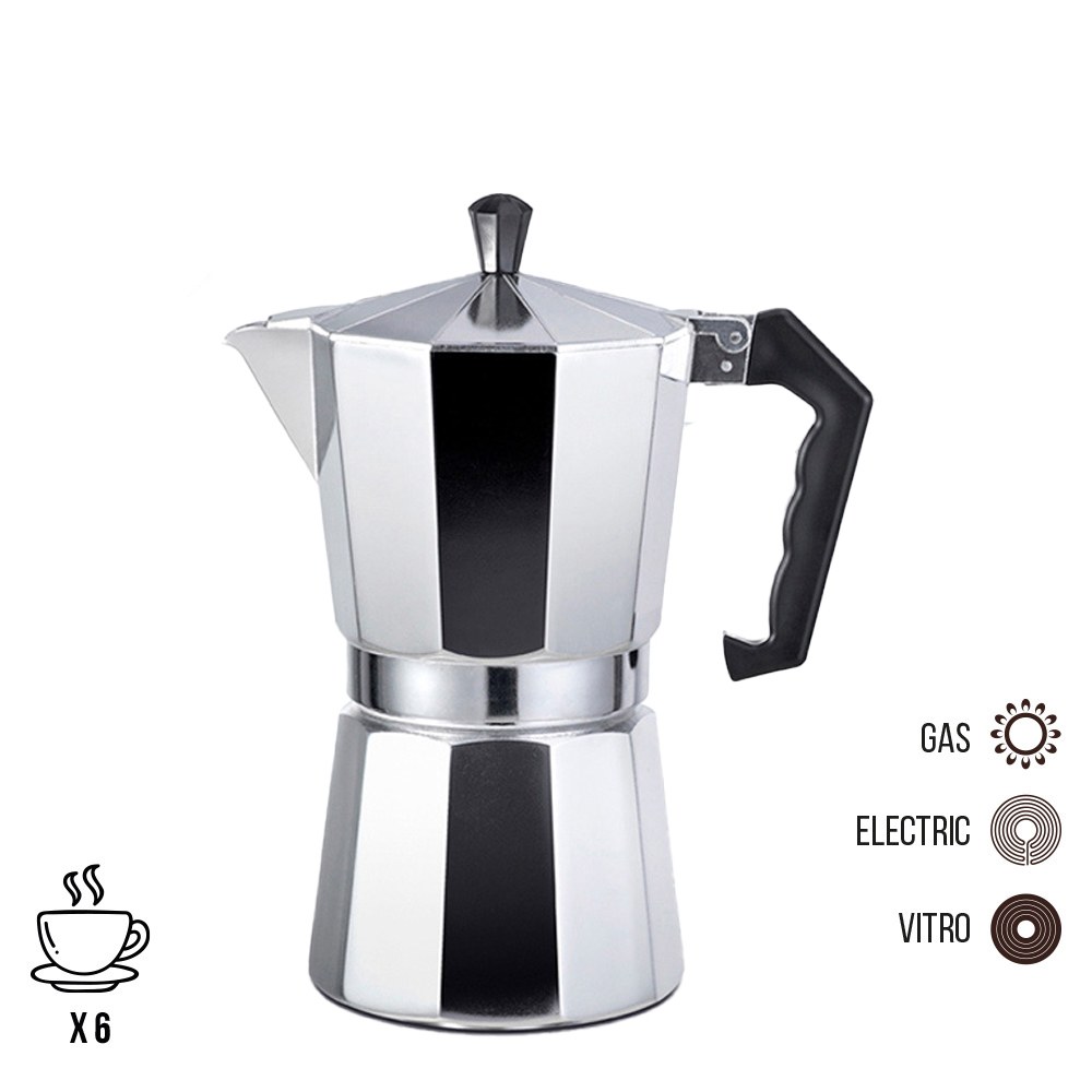 CAFETERA DE ALUMINIO 6 TAZAS. APTA PARA GAS, VITROCERAMICA Y PLACA ELECTRICA. FABRICADA SEGUN NORMATIVA UE DE PRODUCTOS EN CONTACTO DIRECTO CON LOS ALIMENTOS