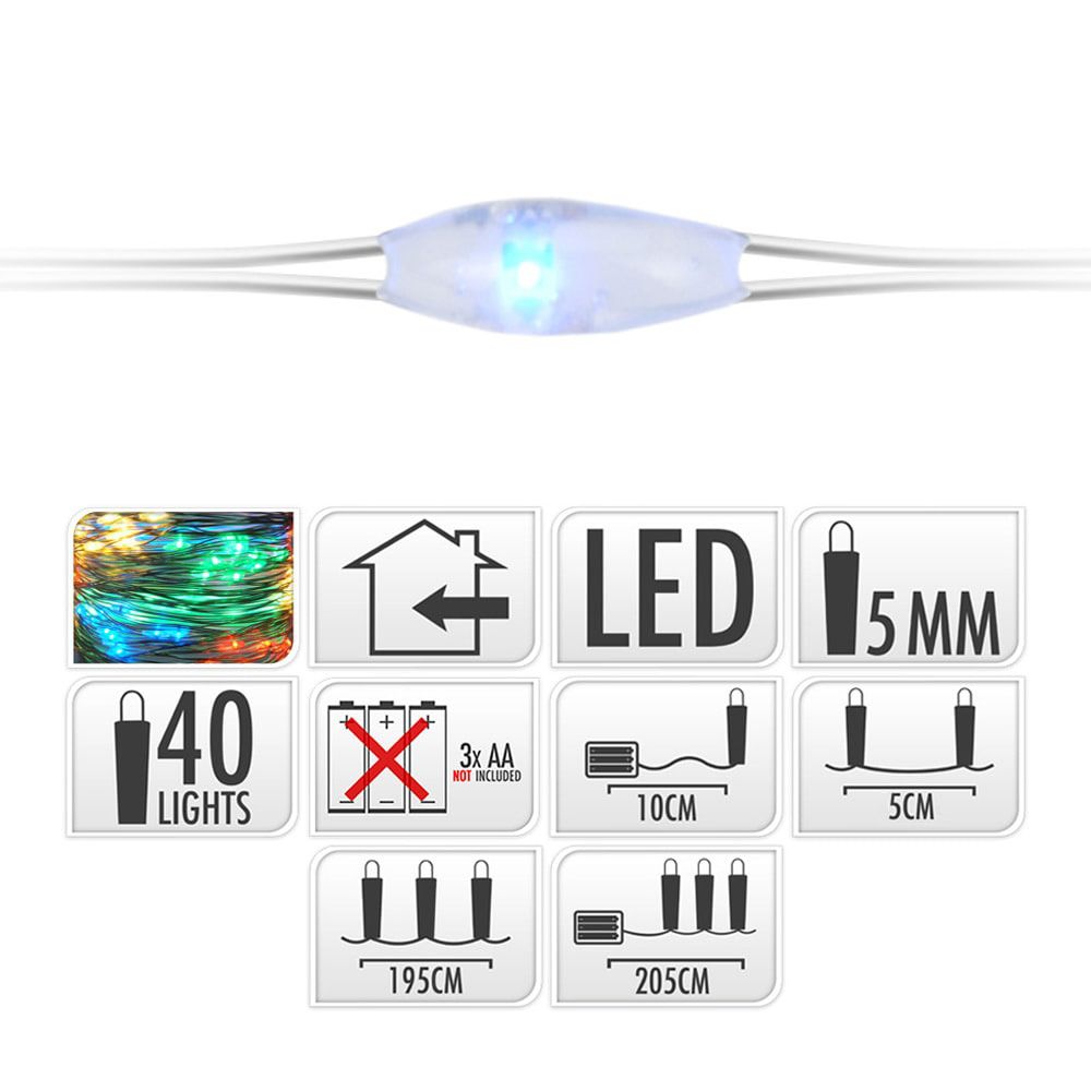 GUIRNALDA A PILAS, FUNCIÓN FIJA, 40 LEDS, CABLE ALAMBRE PLATEADO, LUZ MULTICOLOR, PILAS 3 x AA (NO INCLUIDAS), IP20, DISTANCIA ENTRE BOMBILLAS 5 cm, CABLE ALIMENTACIÓN 10 cm. DISTANCIA ENTRE LA PRIMERA BOMBILLA Y LA ÚLTIMA: 195 cm. LARGO TOTAL: 2,05 m
