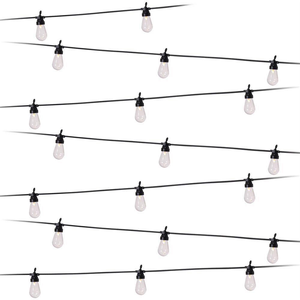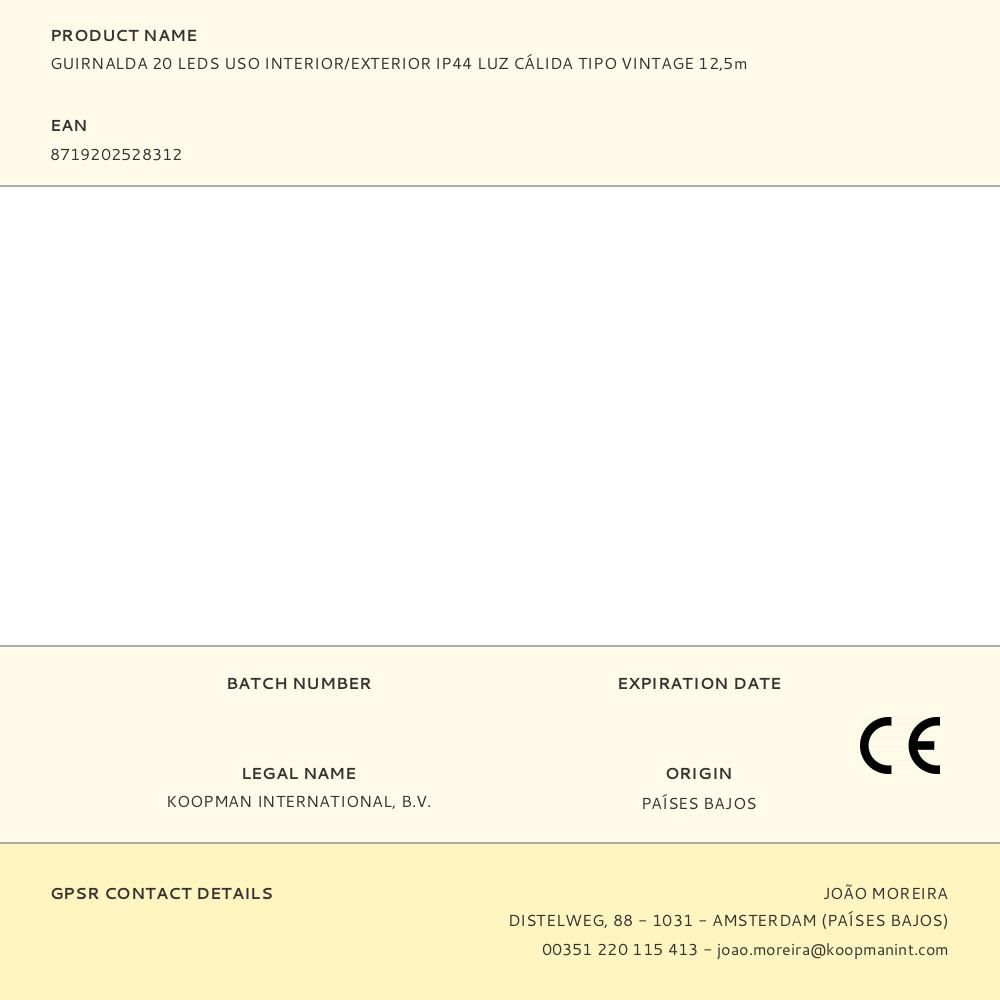 GUIRNALDA 20 LEDS USO INTERIOR/EXTERIOR IP44. LUZ CÁLIDA. TIPO VINTAGE. CABLE COLOR NEGRO 12,5m 50cm DISTANCIA ENTRE BOMBILLAS. 10m DE LARGO DE GUIRNALDAS Y 2,5m DE DISTANCIA ENTRE LA PRIMERA GUIRNALDA Y EL ENCHUFE. DIMENSIONES BOMBILLA: 4x5,5cm (ancho/alto) TENSION: 220-240V