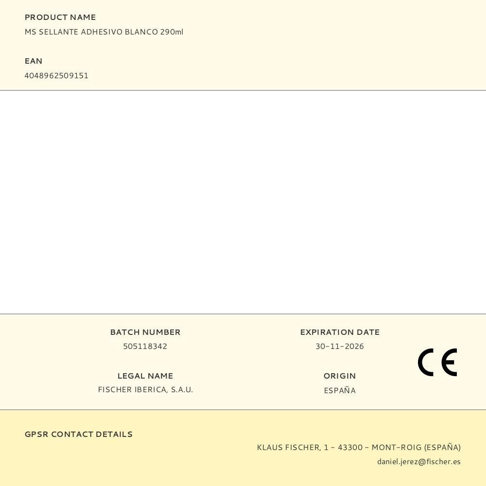 MS SELLANTE ADHESIVO BLANCO FISCHER 290ml PEGA SELLA RELLENA ELASTICO 700% 100kg/10cm² APLICABLE EN HUMEDO INTEMPERIE