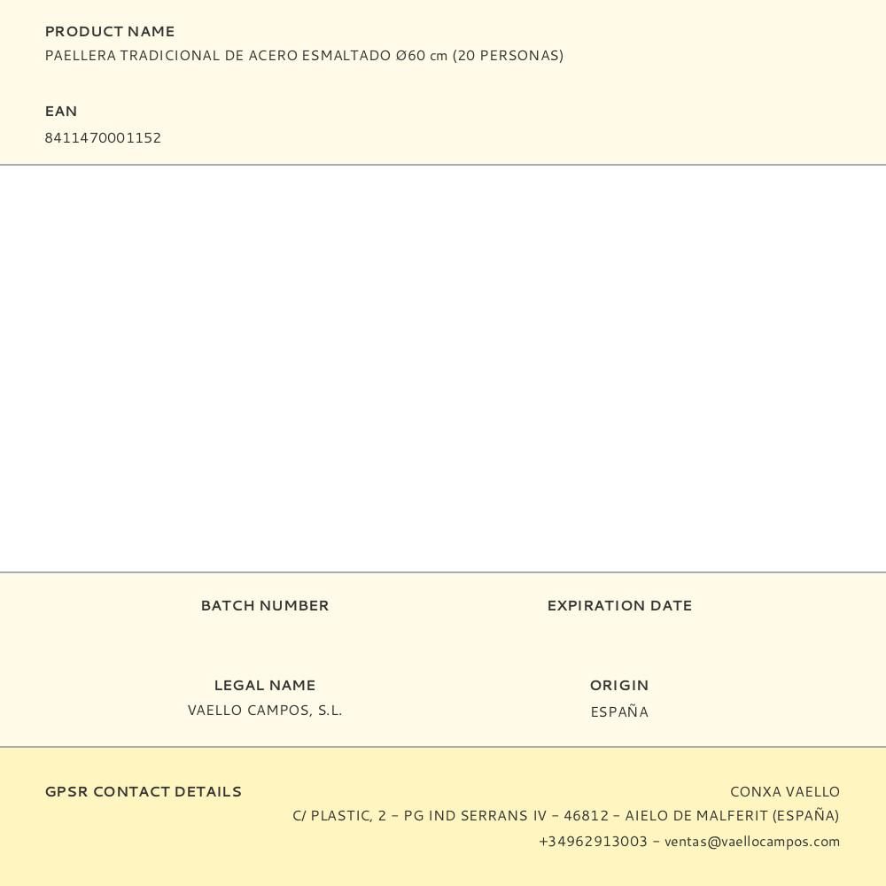 PAELLERA TRADICIONAL DE ACERO ESMALTADO Ø60cm (20 PERSONAS) APTA PARA COCINAS DE GAS. FABRICACION NACIONAL. ATENCIÓN: REQUIERE MANTENIMIENTO. DEBE SER ALMACENADO CON UNA CUBIERTA DE ACEITE. VAELLO