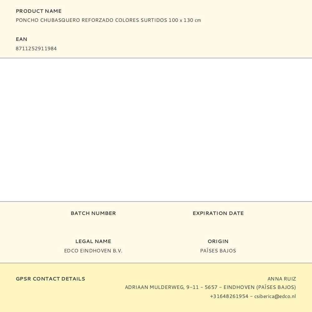 PONCHO CHUBASQUERO REFORZADO COLORES SURTIDOS 100 x 130 cm