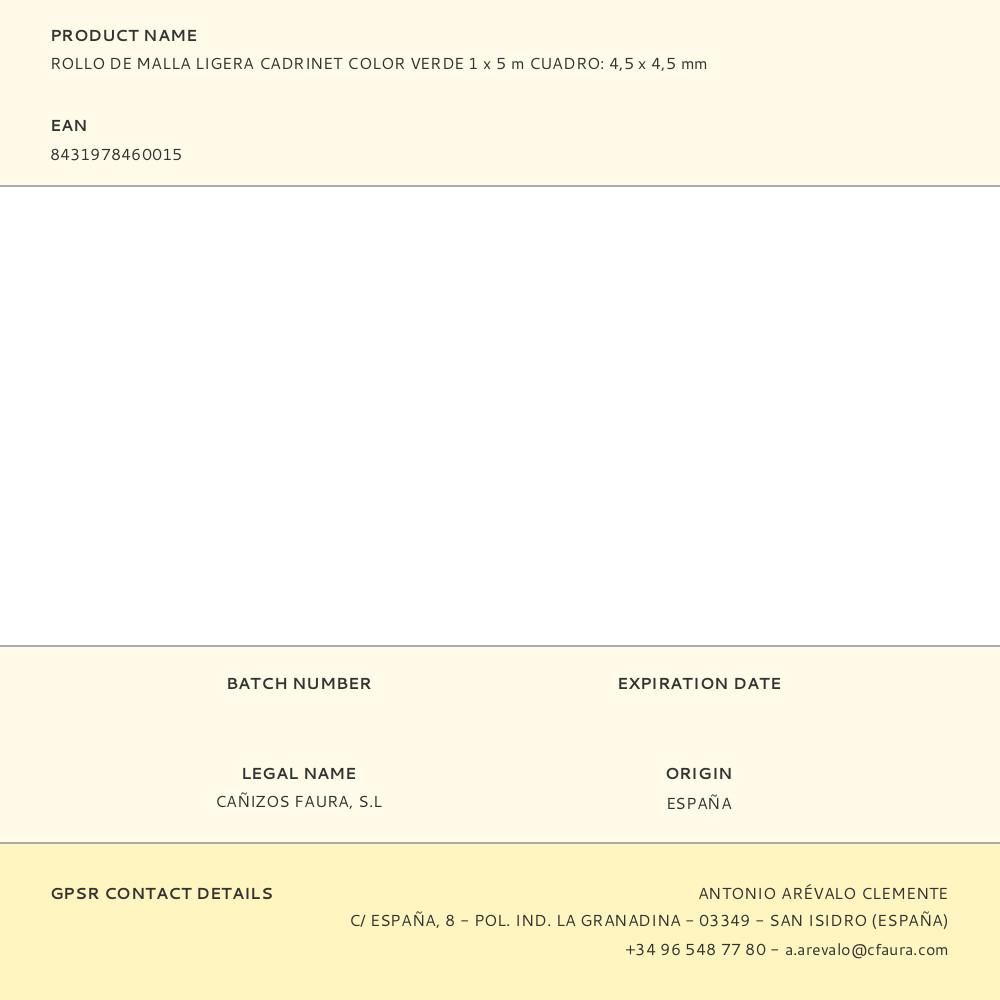 ROLLO DE MALLA LIGERA CADRINET COLOR VERDE 1x5m CUADRO: 4,5x4,5mm MATERIAL: POLIPROPILENO TERMOSOLDADO. FACILMENTE ADAPTABLE A CUALQUIER SUPERFICIE. TRATAMIENTO ANTI UV. FAURA