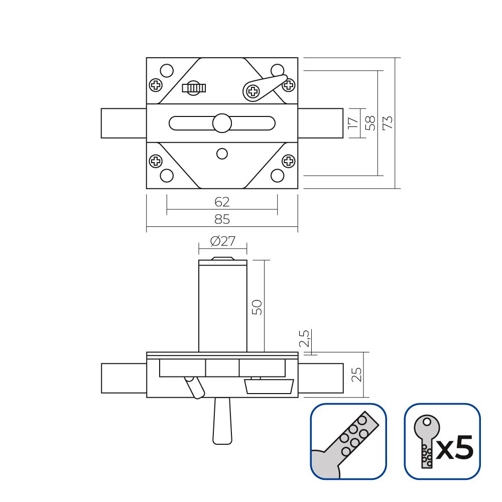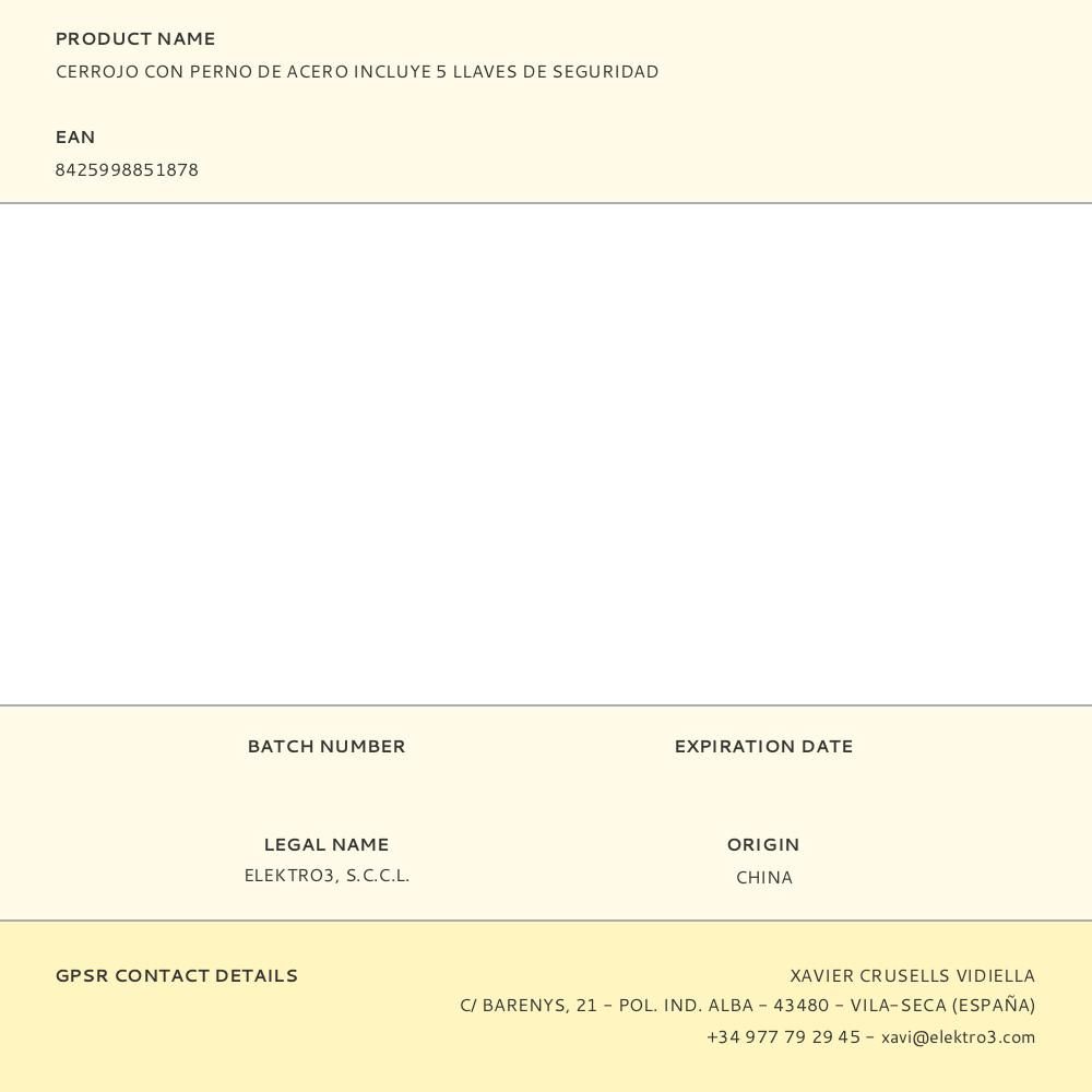 CERROJO CON PERNO DE ACERO INCLUYE 5 LLAVES DE SEGURIDAD