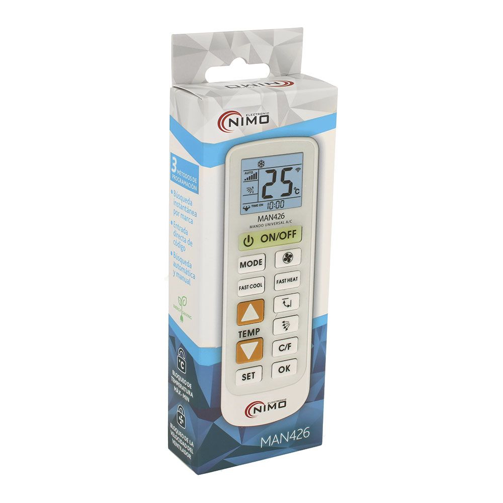 MANDO UNIVERSAL PARA AIRE ACONDICIONADO CON 5000 CÓDIGOS. VÁLIDO PARA TODAS LAS MARCAS, OPCIÓN ECO, BLOQUEO DE TEMPERATURA MÁX.-MIN. FUNCIÓN DE TERMÓMETRO, PANTALLA ILUMINADA, 3 MÉTODOS DE PROGRAMACIÓN: BÚSQUEDA INSTANTÁNEA POR MARCA, ENTRADA DIRECTA DE CÓDIGO O BÚSQUEDA AUTOMÁTICA Y MANUAL. ALIMENTACIÓN PILAS 2xAAA (NO INCLUIDAS).
