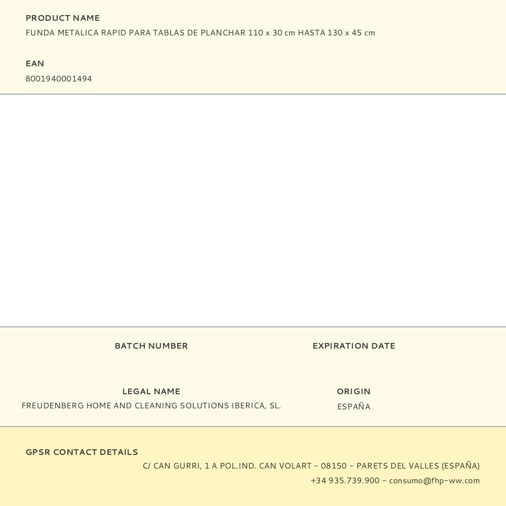 FUNDA METÁLICA CON PARTÍCULAS DE ALUMINIO PARA MAYOR RAPIDEZ EN EL PLANCHADO. COMPUESTA POR DOS CAPAS: ALGODÓN METALIZADO Y ESPUMA. FIJACIÓN FÁCIL CON UN CLIP. SE ADAPTA A TODAS LAS TABLAS CON MEDIDAS DE 110 x 30 cm Y 130 x 45 cm