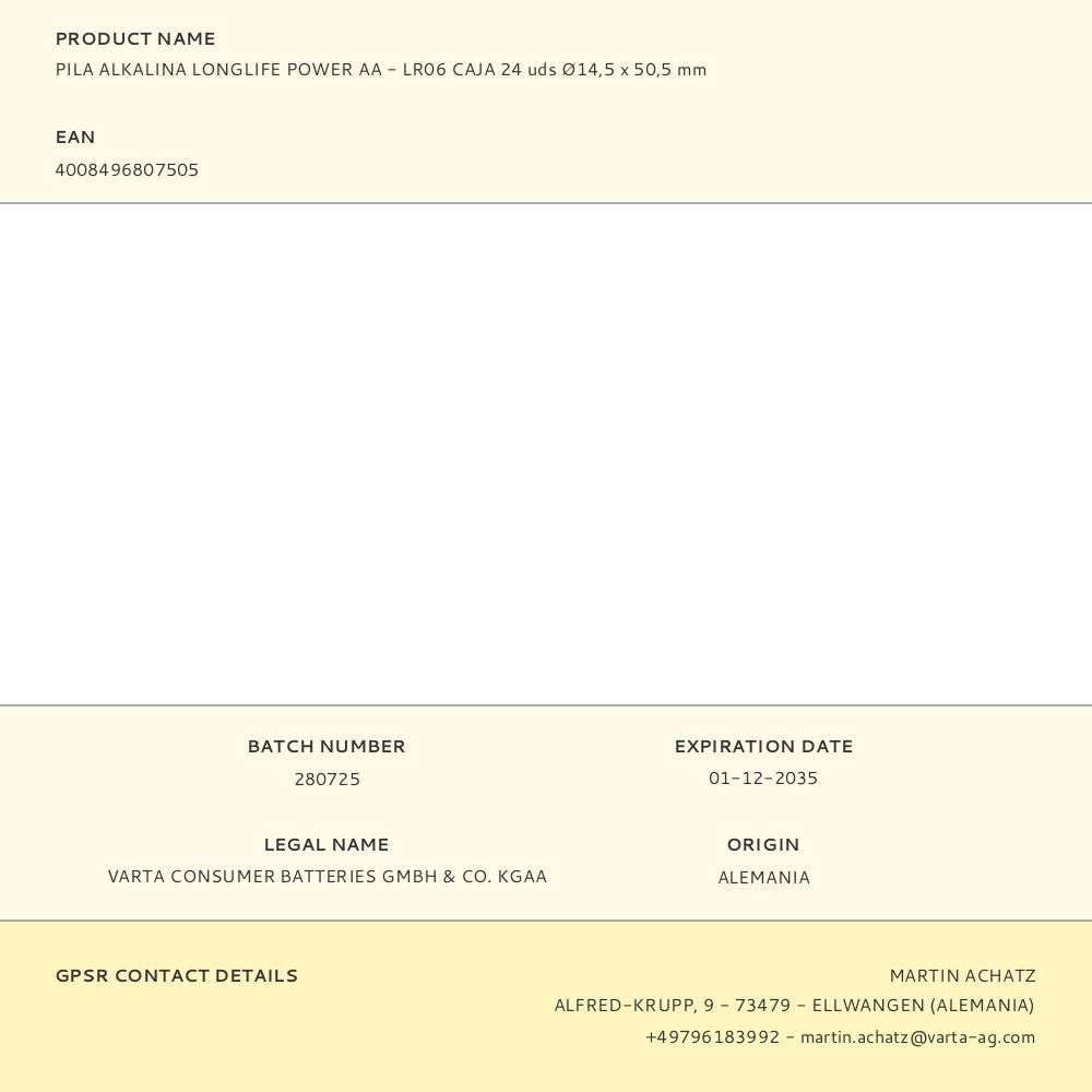 PILA VARTA LONGLIFE POWER AA - LR06 CAJA 24 unid. Ø14,5x50,5mm (diámetro/alto)