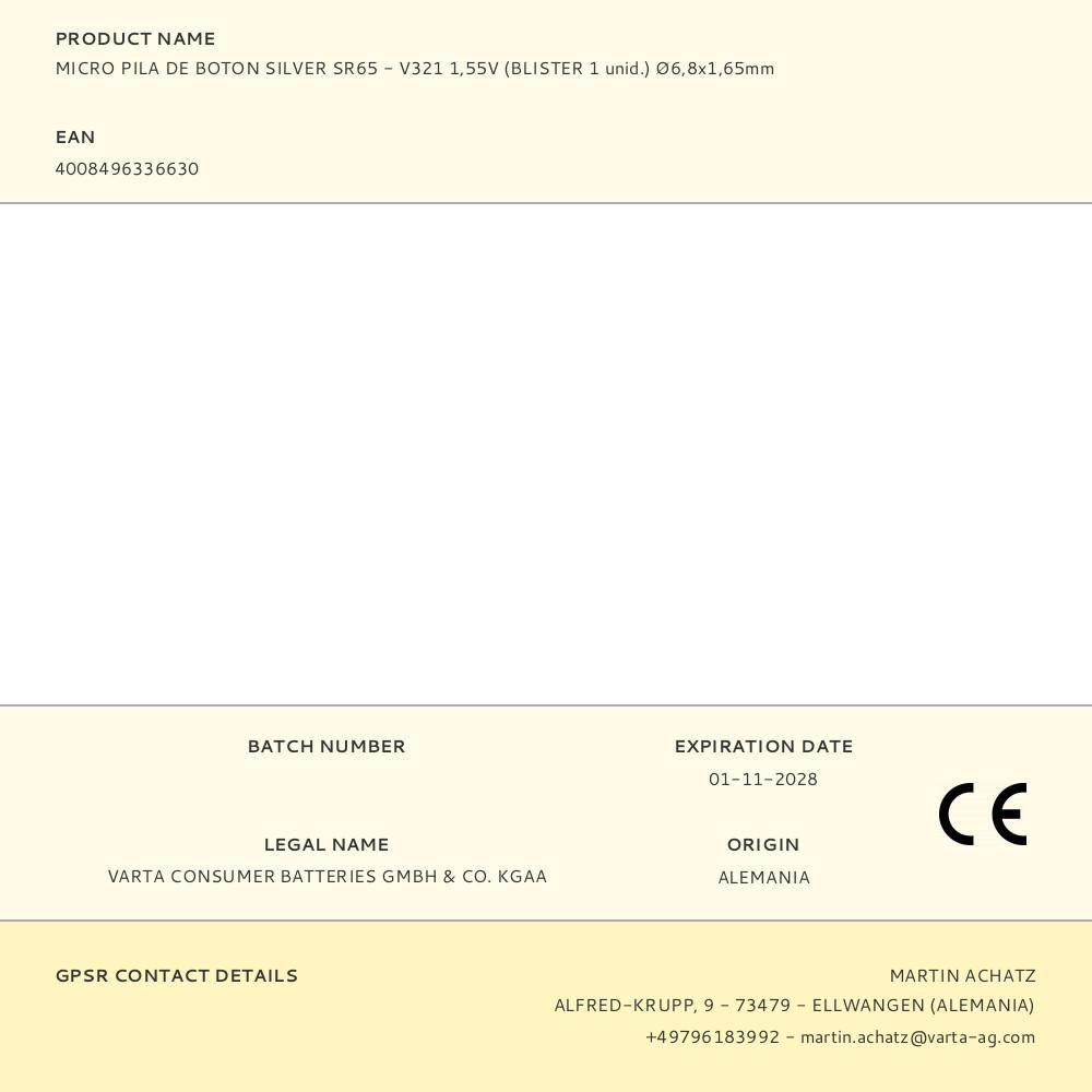 MICRO PILA DE BOTÓN SILVER SR65 - V321 1,55 V Ø6,8 x 1,65 mm BLISTER
