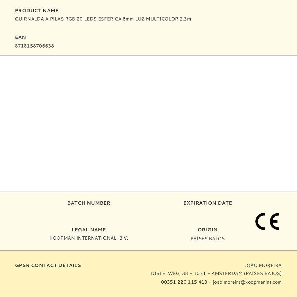 GUIRNALDA A PILAS RGB 20 LEDS ESFERICA 8mm LUZ MULTICOLOR PILAS 2xAA NO INCLUIDAS IP20 CABLE TRANSPARENTE 10cm ENTRE BOMBILLAS LED CABLE ALIMENTACIÓN 30cm. DISTANCIA ENTRE LA PRIMERA BOMBILLA Y LA ULTIMA 2m. LARGO TOTAL: 2,3m