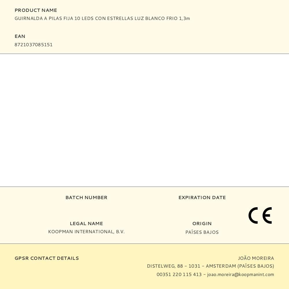 GUIRNALDA A PILAS FIJA 10 LEDS CON ESTRELLAS LUZ BLANCO FRIO 1,3m PILAS 2xAA NO INCLUIDAS IP20 CABLE TRANSPARENTE 10cm ENTRE BOMBILLAS LEDS CABLE ALIMENTACIÓN 30cm. DISTANCIA ENTRE LA PRIMERA BOMBILLA Y LA ULTIMA 1m. LARGO TOTAL: 1,3m
