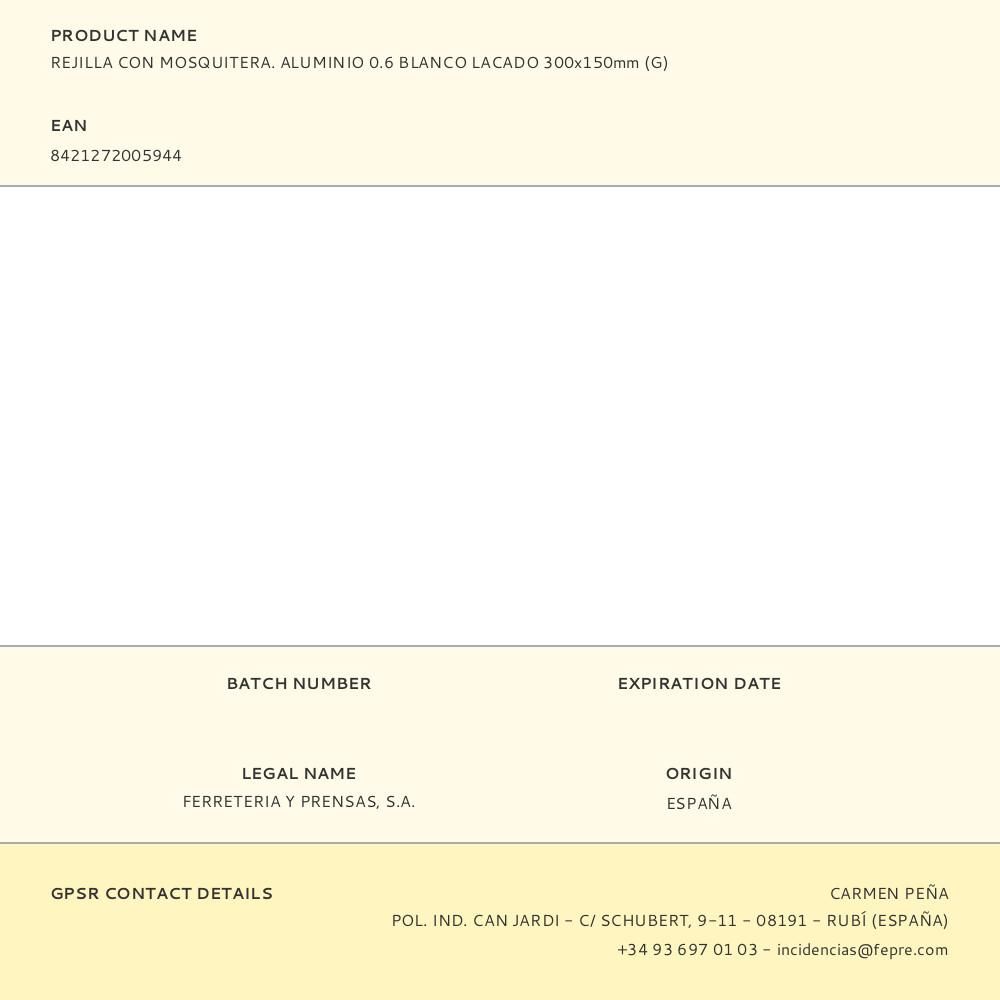 REJILLA CON MOSQUITERA. ALUMINIO 0.6 BLANCO LACADO 300x150mm (G) (ancho/alto)