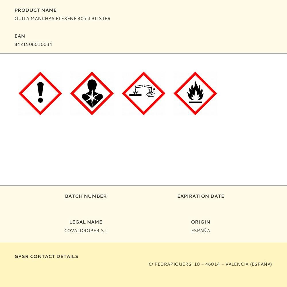 QUITAMANCHAS FLEXENE 40ml BLISTER. ELIMINA MANCHAS DE BOLÍGRAFO,ROTULADOR,TINTA CHINA, BETÚN, HOLLÍN, CAFÉ ,HIERBA,VINO,RESINA,PINTURA,ALQUITRAN,PEGAMENTO,SUDOR,LICORES,HELADO,GRASA ETC.ECHAR UNA PEQUEÑA CANTIDAD EN LA MANCHA, FROTAR Y ACLARAR CON ABUNDANTE AGUA.SE PUEDE UTILIZAR EN TODO TIPO DE TEJIDOS,NO ALTERA LOS COLORES.BIODEGRADABLE.