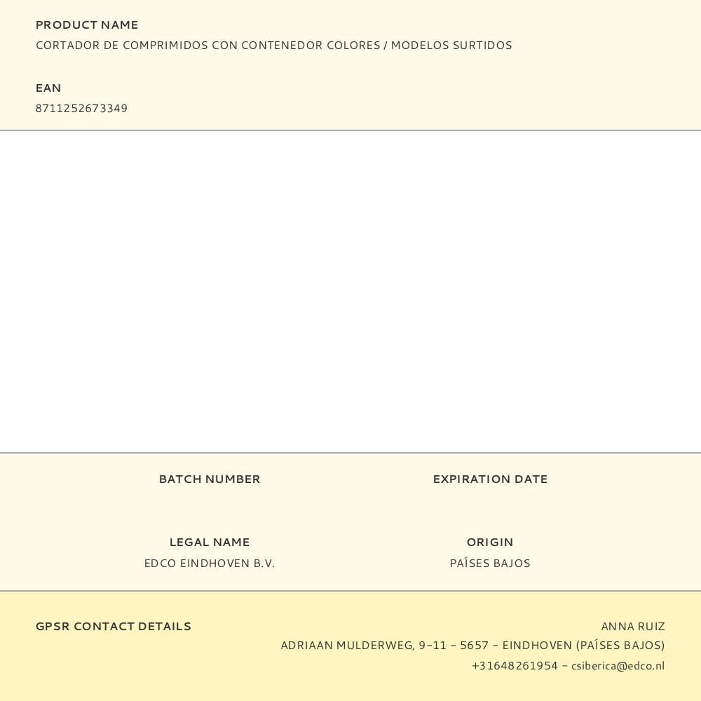 CORTADOR DE COMPRIMIDOS CON CONTENEDOR. FABRICADO EN PLÁSTICO. FRACCIONA LA PASTILLA Y PUEDES GUARDARLA EN EL CONTENEDOR. COLORES / MODELOS SURTIDOS