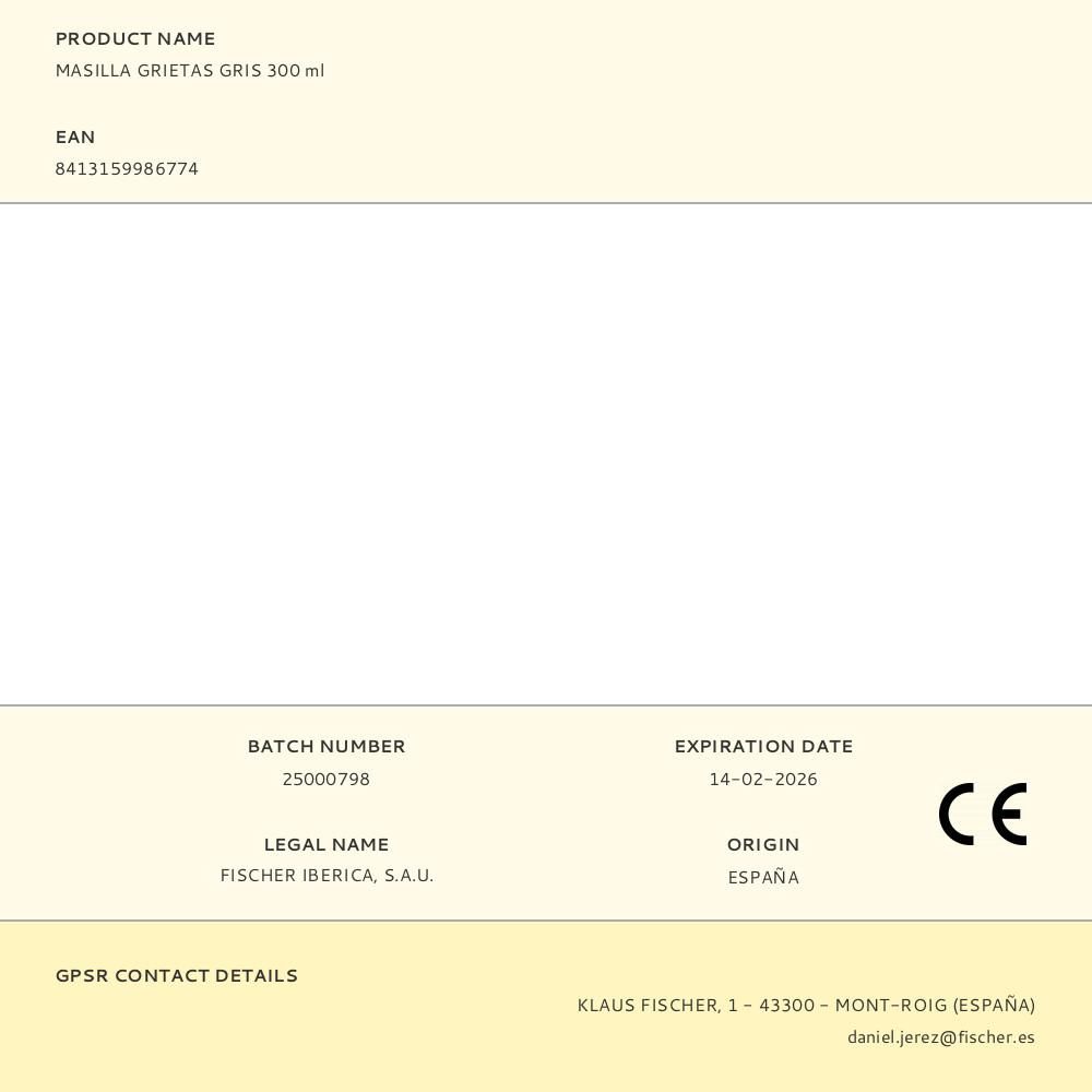 MASILLA GRIETAS GRIS 300 ml. MASILLA ACRILICA A BASE DE RESINAS MODIFICADAS. USO GENERAL SOBRE JUNTAS CON MOVIMIENTO INFERIOR AL 10%. COMPATIBLE CON LA MAYORIA DE LOS MATERIALES UTILITZADOS EN LA CONSTRUCCION (HORMIGON, MADERA, LADRILLO, PIEDRAS NATURASES Y ARTIFICIALES, ETC)