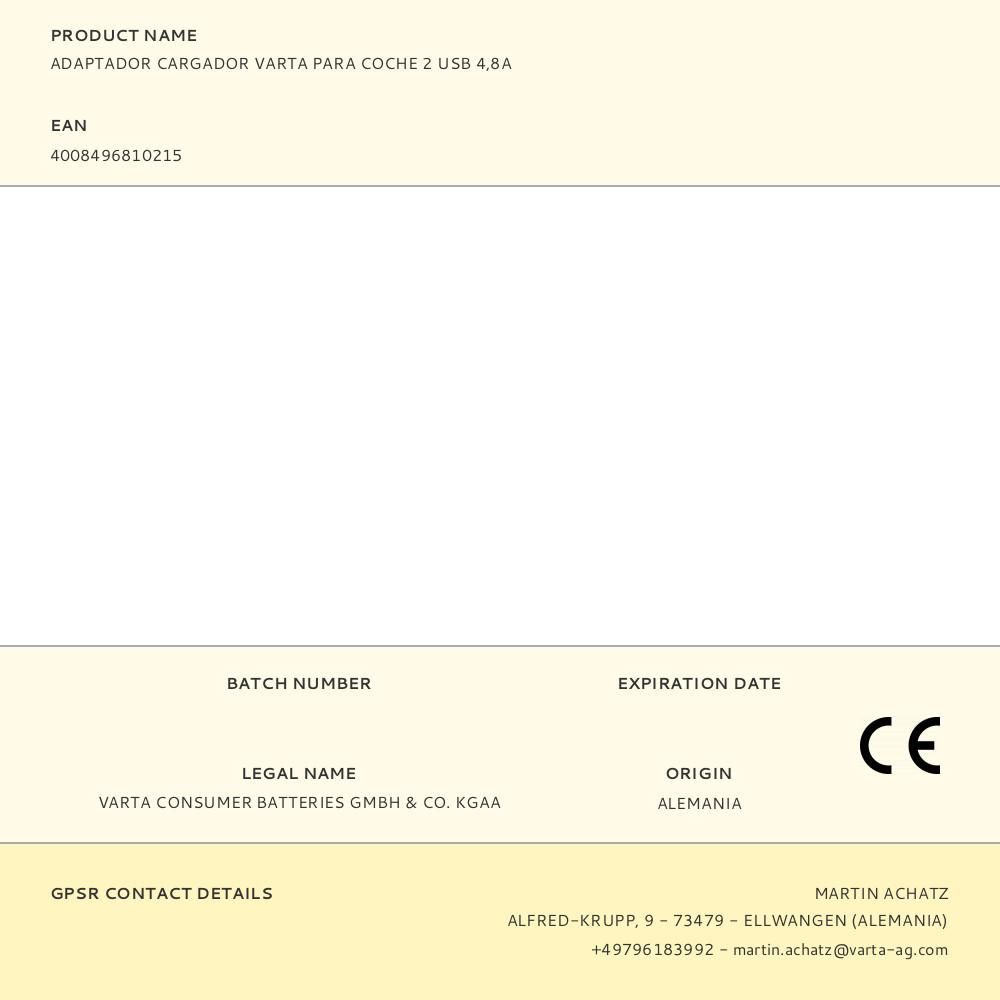 ADAPTADOR CARGADOR VARTA PARA COCHE 2 USB 4,8A