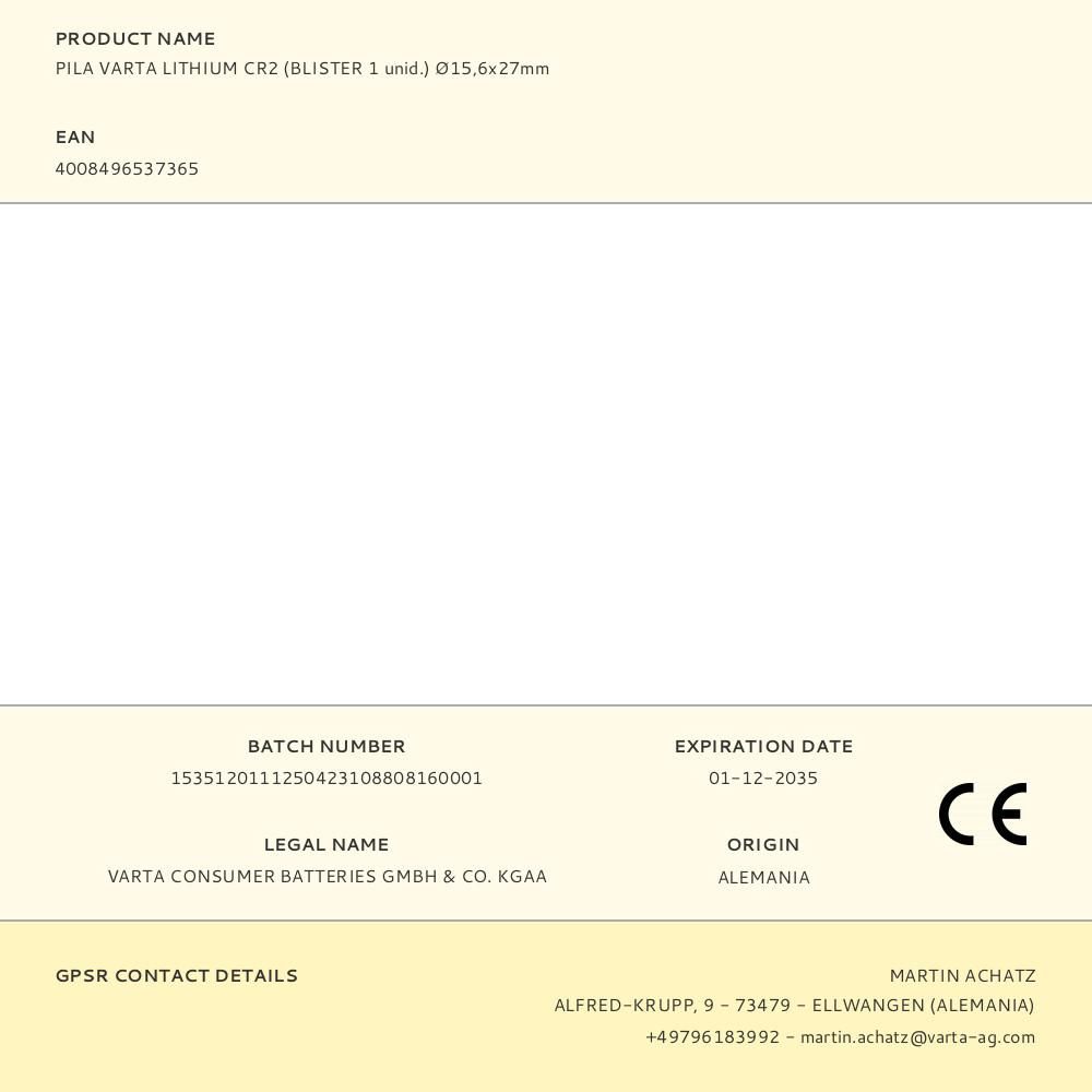 PILA VARTA LITHIUM CR2 (BLISTER 1 unid.) Ø15,6x27mm