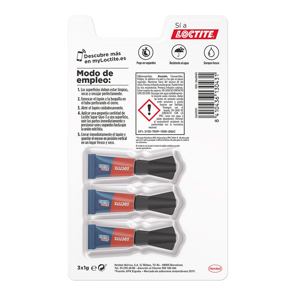 SUPER GLUE MINI TRIO 3 x 1 g PRACTICO ENVASE DE UNA DOSIS ADHESIVO UNIVERSAL INSTANTANEO MAXIMA FUERZA UNION EN POCOS SEGUNDOS NUEVA FORMULA RESITENTE AL AGUA Y AL LAVAVAJILLAS PARA PEGAR EN POCOS SEGUNDOS TODOS LOS TIPOS DE MATERIALES: PORCELANA, MADERA, PLASTICO, METAL, GOMA, CUERO, MARMOL