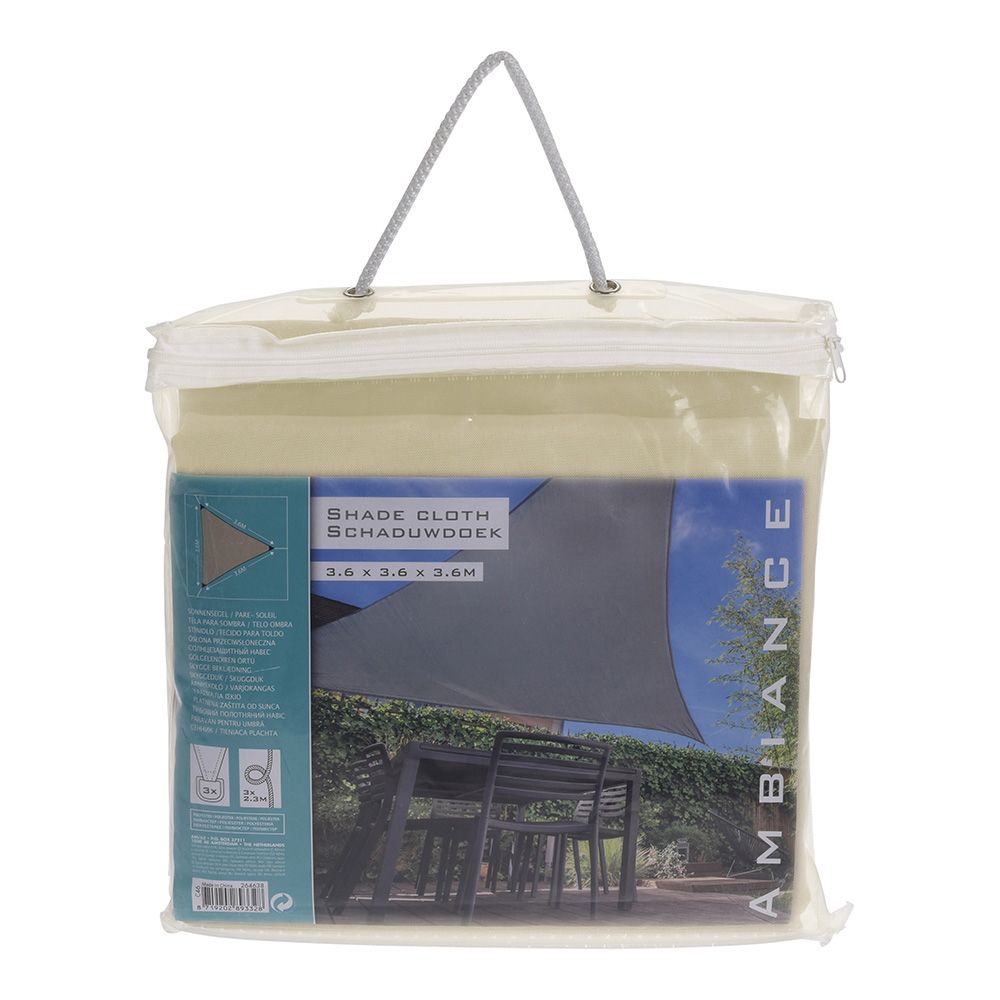 TOLDO VELA TRIÁNGULO COLOR ARENA, 3,60 x 3,60 x 3,60 m, 170 g/m², RESISTENTE AL AGUA, UPF CLASIFICACIÓN 50+, ANILLAS DE METAL, 3 CORDONES DE 2,3 m, BOLSA CON CREMALLERA