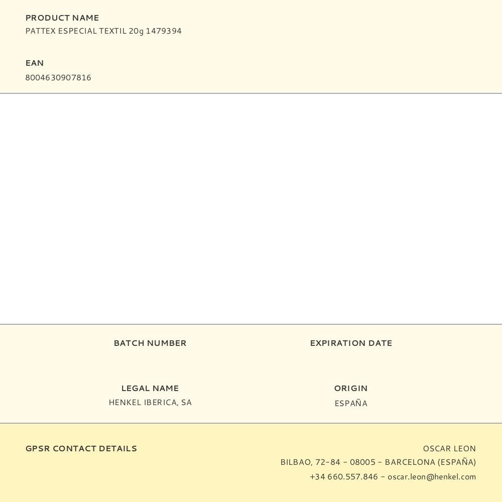 PATTEX ESPECIAL TEXTIL 20g ADHESIVO ESPECIFICO PARA TEJIDOS RESULTA PERFECTO PARA UNIONES ENTRE TODO TIPO DE TEJIDOS TALES COMO ALGODON, TEJANO, FIBRAS SINTETICAS, ENTRE OTROS