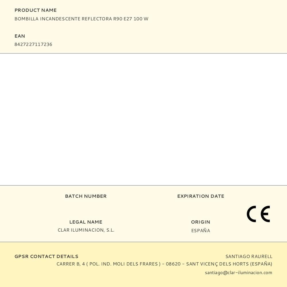 BOMBILLA INCANDESCENTE REFLECTORA R90 E-27 100W. 2700K. 1000h. ANGULO DE APERTURA: 120°. TENSION: 220-240V.