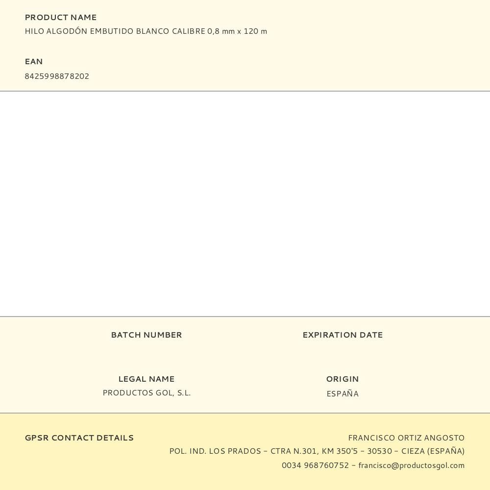 HILO ALGODON EMBUTIDO 50g/120m BLANCO. COMPOSICION: ALGODON NATURAL TORCIDO A 6 CABOS. N° REGISTRO SANITARIO: 39.01933/A. CARACTERISTICAS: FLEXIBLE, BUENA RESISTENCIA, SEGURIDAD EN EL NUDO. NO SE DESHACE. UTILIDADES: INDUSTRIAS ALIMENTACION, ETIQUETAS, ARTESANIA, MANUALIDADES, COMERCIO, PAQUETERIA, ETC