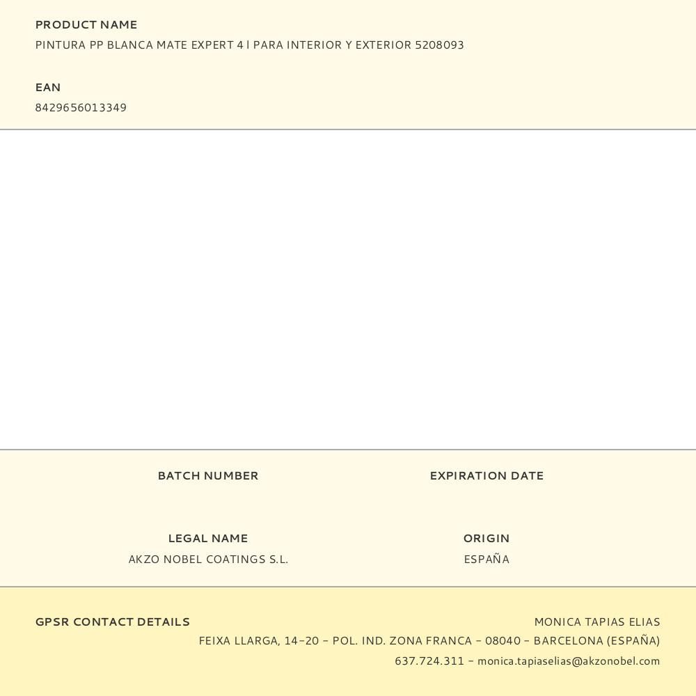 PINTURA PLÁSTICA ACRÍLICA ESTIRENADA INTERIOR/EXTERIOR DE 4 l CON CONSERVANTE ANTIMOHO EXPERT. PINTURA BLANCO MATE PARA PAREDES Y TECHOS DE ÓPTIMA OPACIDAD Y ACABADO LISO. RENDIMIENTO: 8-11 m²/l. MÁXIMA RESISTENCIA AL FROTE (LAVABILIDAD CLASE 2) Y ALTA BLANCURA - NO SALPICA DURANTE SU APLICACIÓN. ACABADO BLANCO MATE, FÁCIL APLICACIÓN CON BROCHA, RODILLO O PISTOLA. SE DISUELVE EN AGUA. TIEMPOS: SECADO AL TACTO 30 MINUTOS, REPINTADO DESPUÉS DE 3 HORAS. DENSIDAD: 1,57 ± 0,04. CONTENIDO MÁX. COV: 25 g/l (LÍMITE 2004/42/IIA (a) 30 g/l). CUMPLE NORMATIVAS UNE-EN 13300 (OPACIDAD CLASE 3) Y DIRECTIVA 2004/42/CE