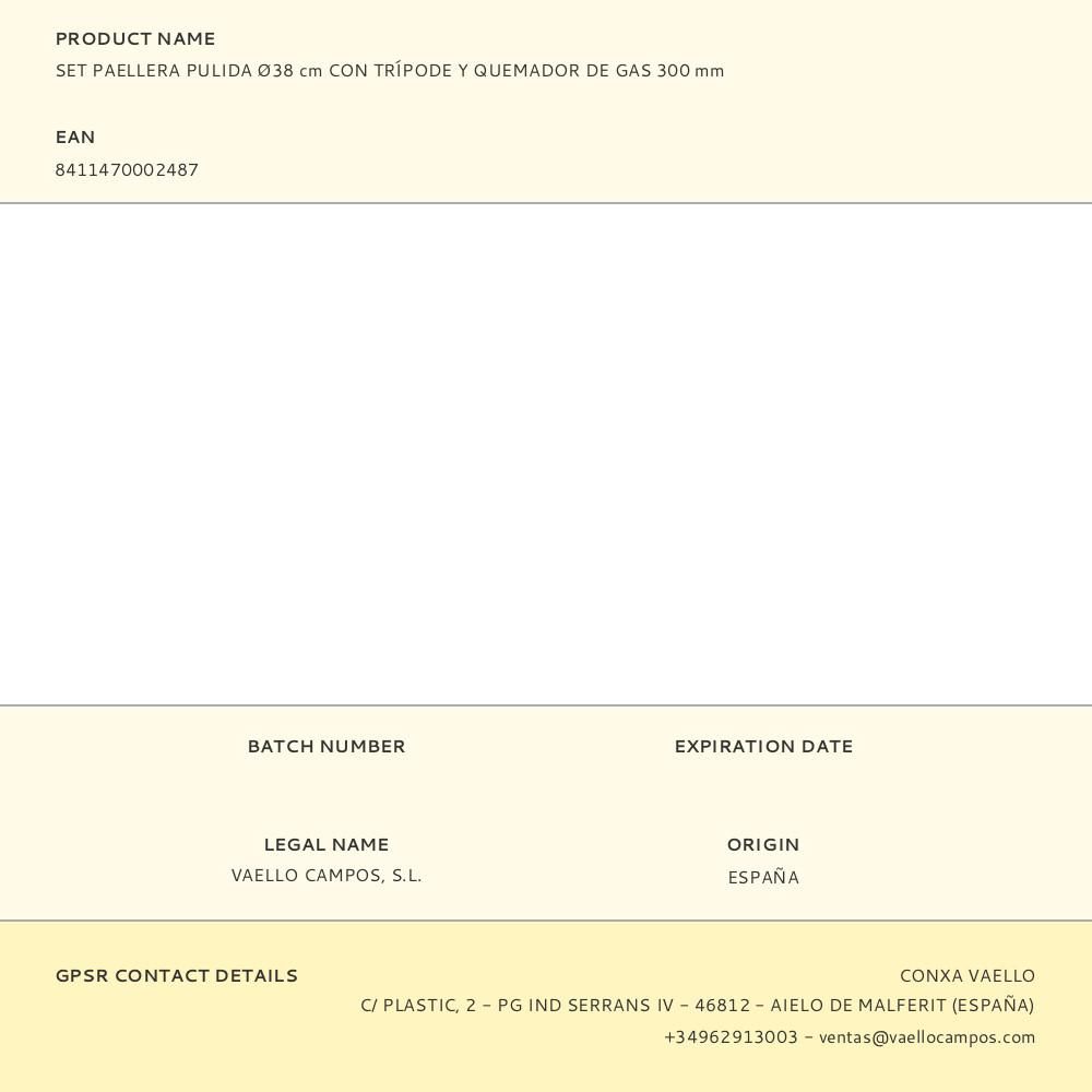 SET PAELLERA PULIDA Ø38cm CON TRÍPODE Y QUEMADOR DE GAS 300mm INCLUYE PAELLERA DE ACERO PULIDO Ø38cm APROX 8 PORCIONES ALTURA TRIPODE 60cm. VAELLO